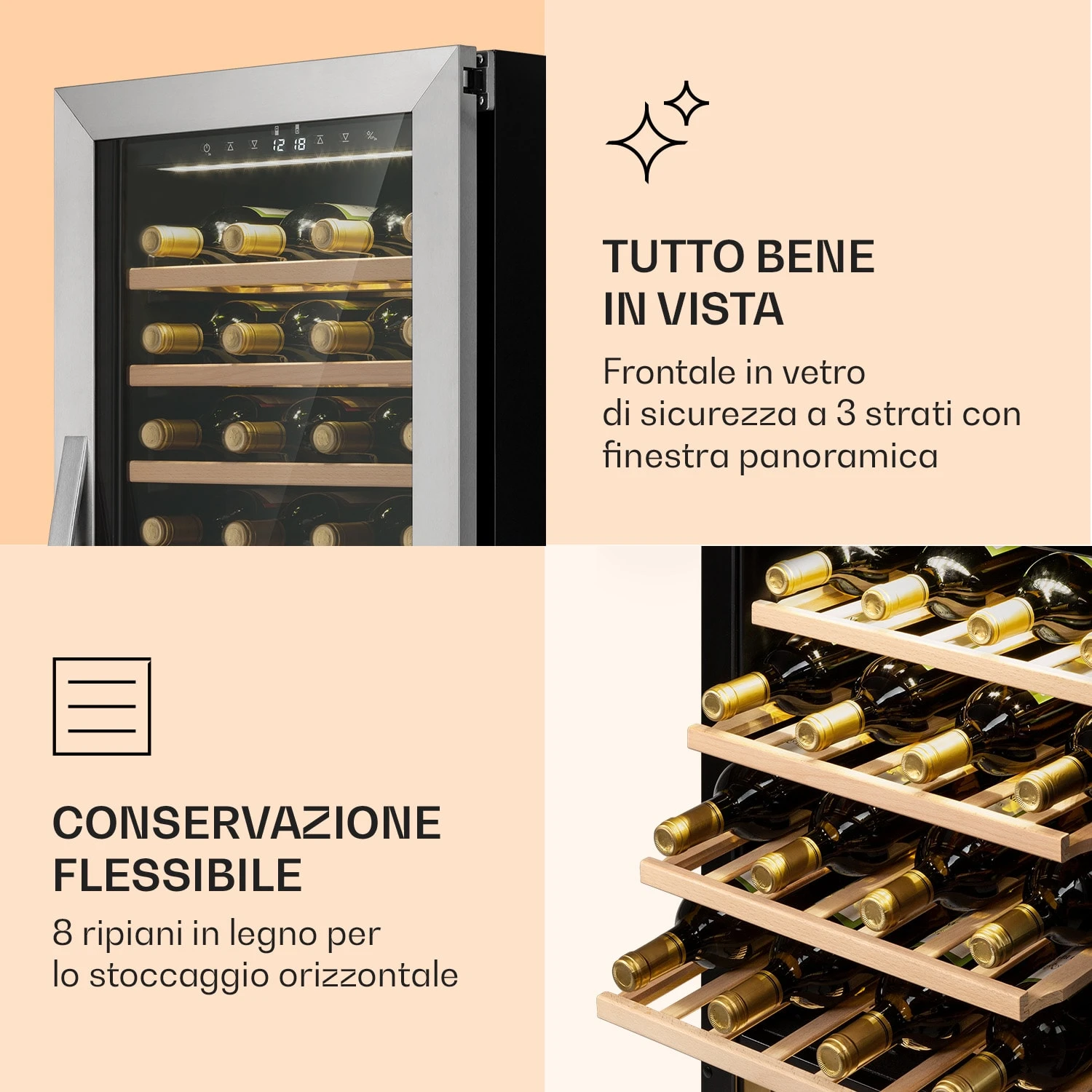 Il grande vano interno con 8 ripiani in legno estraibili assicura un’elegantissima accoglienza alla temperatura ideale per un massimo di 77 bottiglie. Con le sue due zone di raffreddamento separate, vini bianchi e rossi saranno ben conservati, sviluppando al meglio i loro aromi caratteristici tra i 5 e i 20 °C. La temperatura è impostabie tramite un chiaro pannello touch con schermo LCD. L’illuminazione LED interna attivabile, il grande sportello in vetro panoramico e il design minimalista fanno di Vinamour 77 Duo un valore aggiunto per la tua casa.
