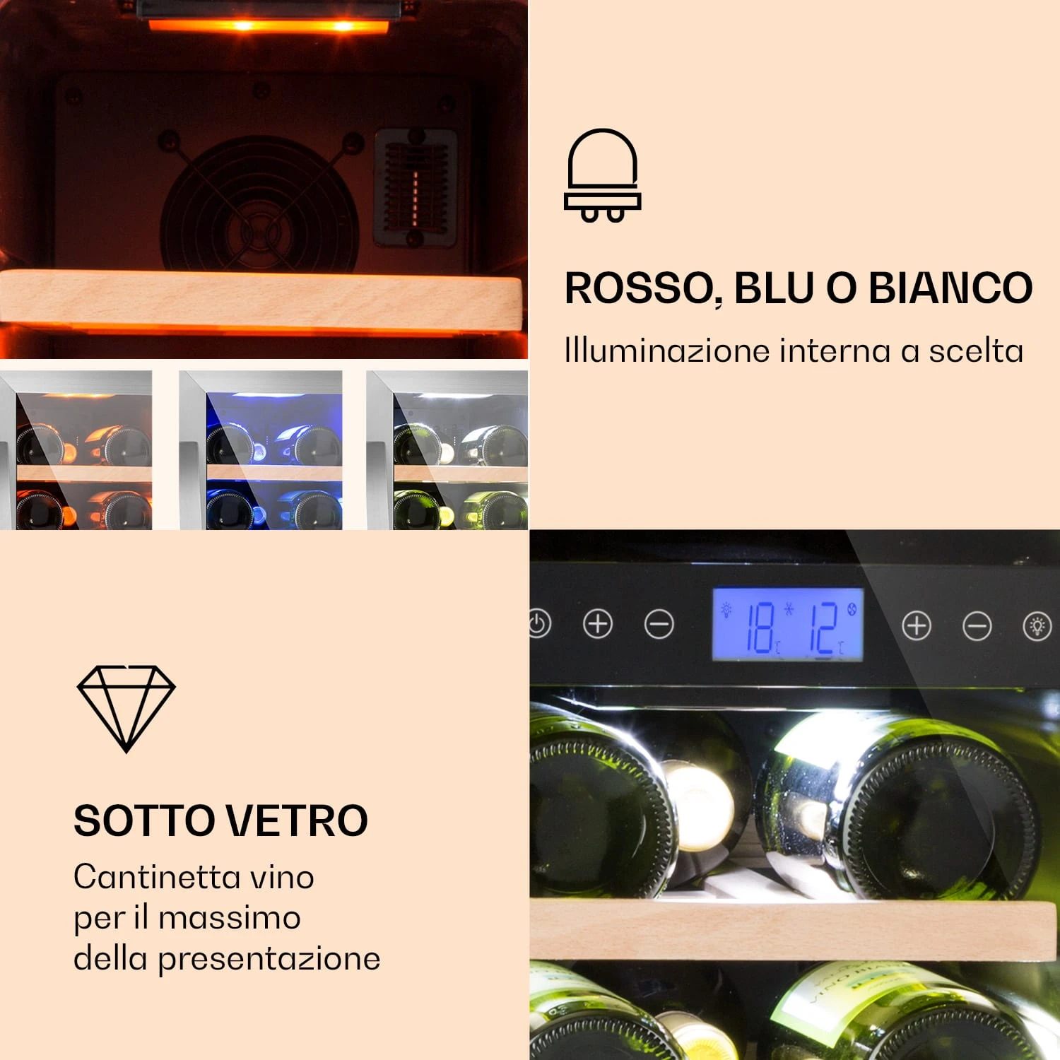 Design elegante e presentazione colorata: la cantinetta-frigo per vini a due zone Vinovilla 17 Built-In Duo di Klarstein si adatta praticamente a ogni spazio grazie al suo design sottile! Le sue due zone possono essere regolate separatamente, permettendo di raffreddare e conservare contemporaneamente vini rossi e bianchi. Ma anche champagne, spumanti, vino frizzante o altre pregiate bollicine si conservano in modo ottimale e per molto tempo in questa cantinetta-frigo per vini . Oltre alle migliori condizioni di conservazione e raffreddamento, questo prodotto offre alla tua collezione di vini un palcoscenico divertente: dietro il vetro, le bottiglie si presentano meravigliosamente illuminate da una luce rossa, blu o bianca.