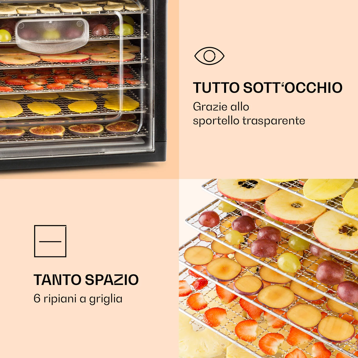 Il potente essiccatore Fruit Jerky Plus 6 di Klarstein permette di estendere in modo particolarmente delicato la conservabilità di alimenti come frutta, verdura, carne, funghi o erbe aromatiche. In questo contesto, Klarstein sfrutta conoscenze antichissime: già secoli fa, gli alimenti venivano essiccati per essere resi più durevoli e disponibili in qualsiasi momento come fonte di vitamine. Oggi, naturalmente, essiccare gli alimenti è molto più facile.