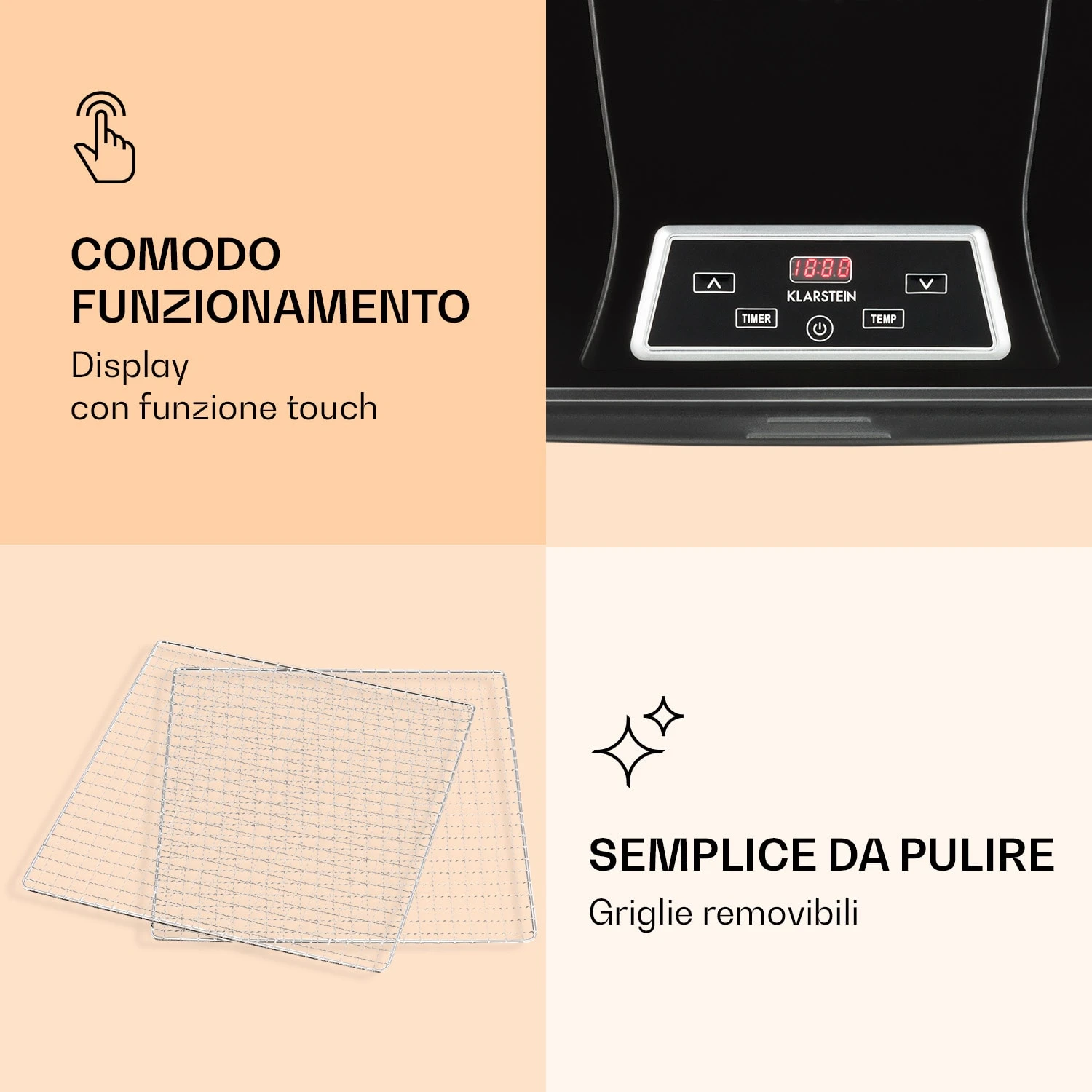Temperatura e durata possono essere comodamente impostate sul display. Basta distribuire gli alimenti desiderati sui diversi livelli, posizionare il coperchio e il gioco è fatto.