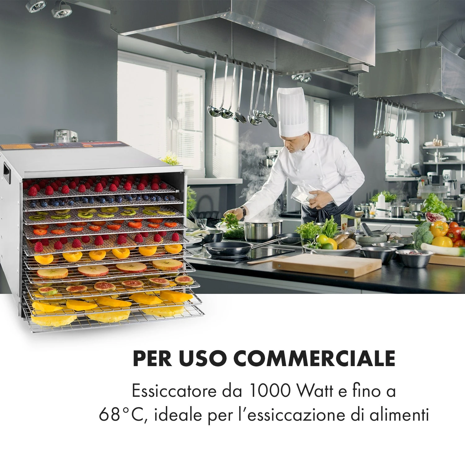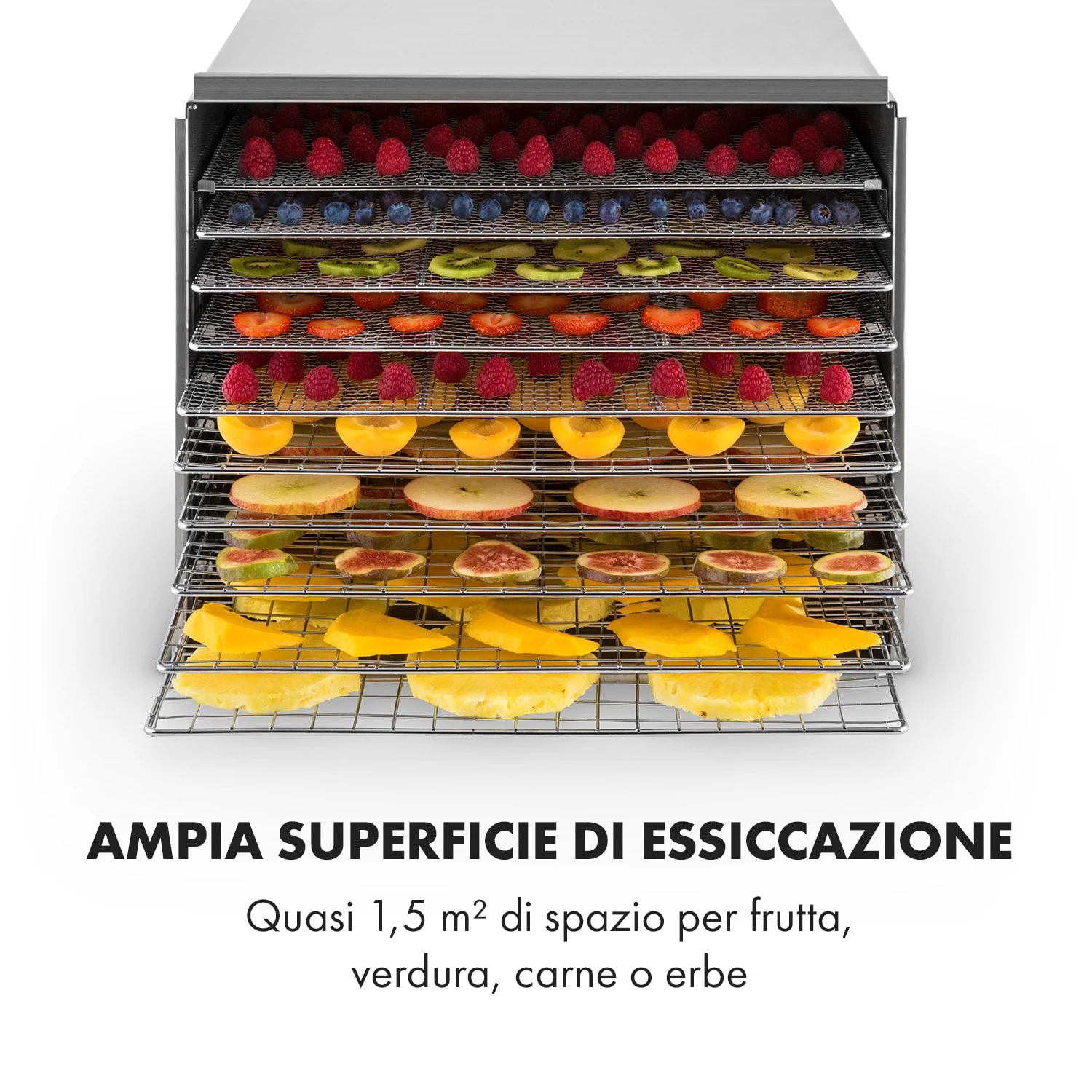I suoi potenti 1000 watt permettono all’aria calda di circolare uniformemente tra i 10 livelli per mezzo di una ventola silenziosissima. Con il pratico controllo dallo schermo LCD, è possibile impostare la temperatura fino a 68 °C su 7 livelli. Una funzione timer permette di impostare la durata di essiccazione a intervalli di un minuto. Con una superficie totale di essiccazione di 1,5 m², anche la preparazione di grandi quantità non è assolutamente un problema. Realizzato interamente in acciaio inox spazzolato, non presenta solo un aspetto stupendo, ma risulta anche facilissimo da pulire.