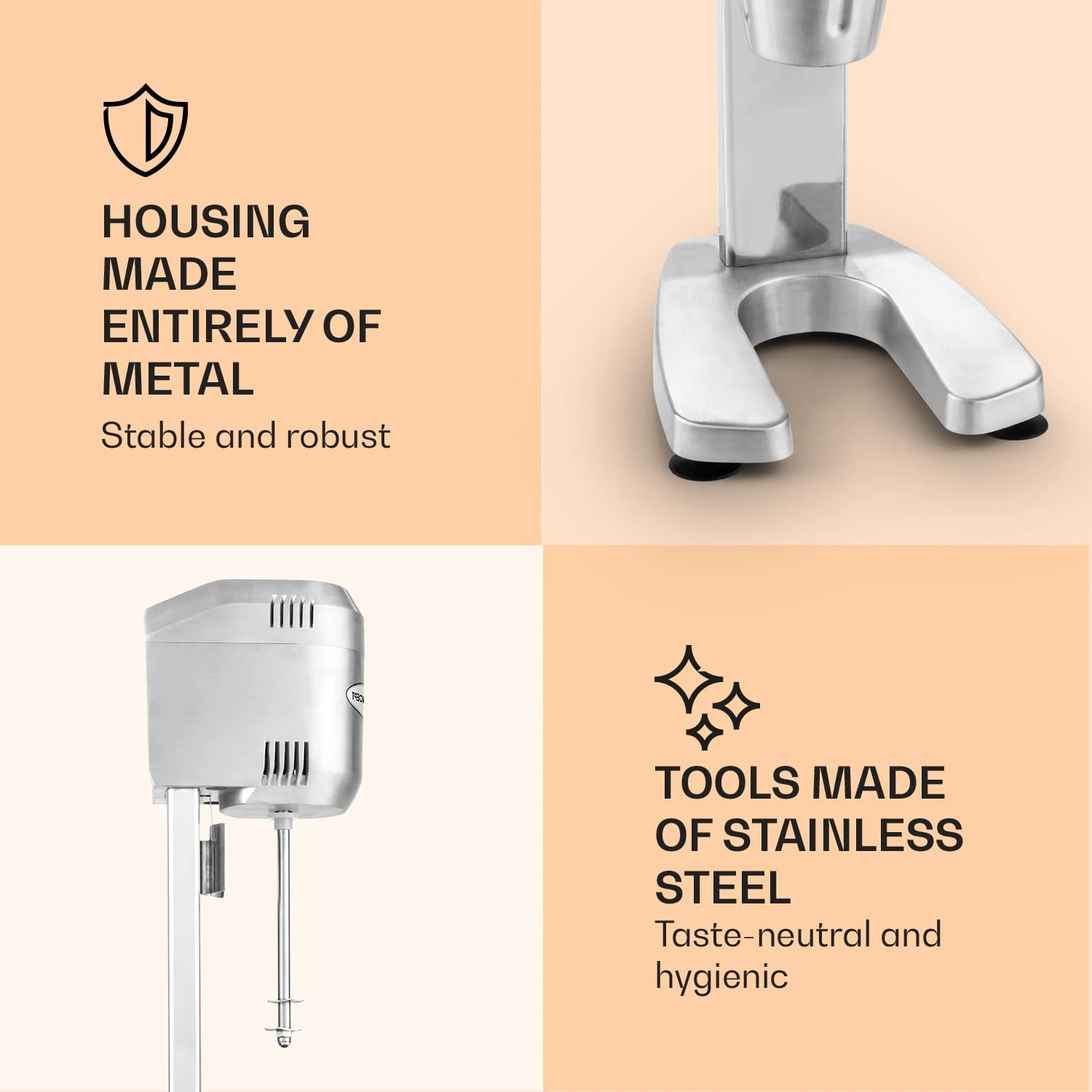 Semplicemente miscelato: con il potente frullatore da bar D-MB di oneConcept si possono preparare deliziosi frullati, cocktail o frappè semplicemente premendo un pulsante. Anche le salse e le puree hanno successo grazie a una potenza di 400 watt e velocità fino a 16000 giri/min. 2 livelli di velocità per mescolare delicatamente e frullare velocemente lo rendono il tuo aiutante di cucina multifunzionale. Con il suo robusto design in metallo, aggiunge un autentico stile da gelateria e milk bar a qualsiasi ambiente.