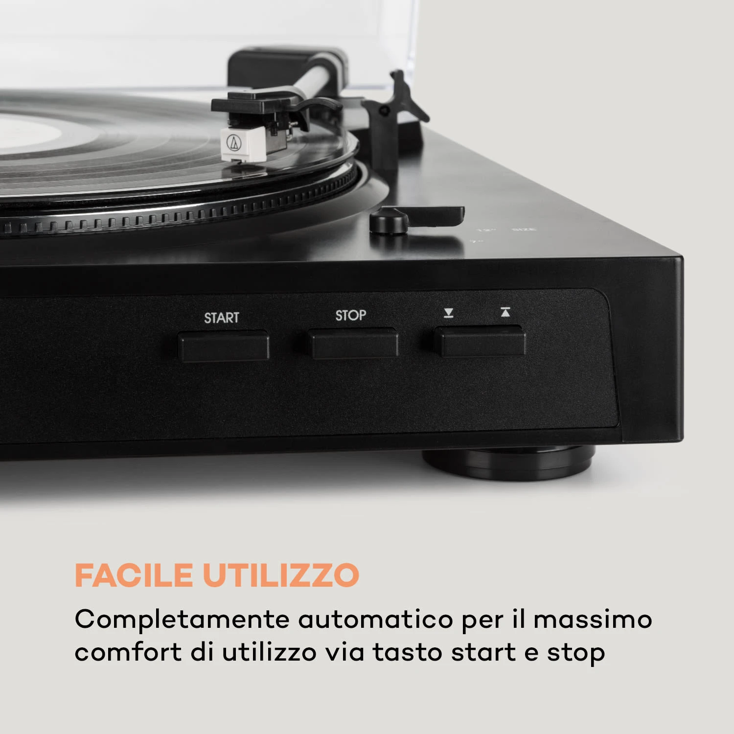 Poiché il giradischi Fullmatic ha un preamplificatore integrato, è particolarmente interessante per gli amanti della musica che vogliono un dispositivo semplice: Con un cavo RCA può essere facilmente collegato a un sistema. Il giradischi auna Fullmatic brilla di semplice eleganza e con un frontale volutamente discreto, in modo che anche l’occhio abbia la sua parte.