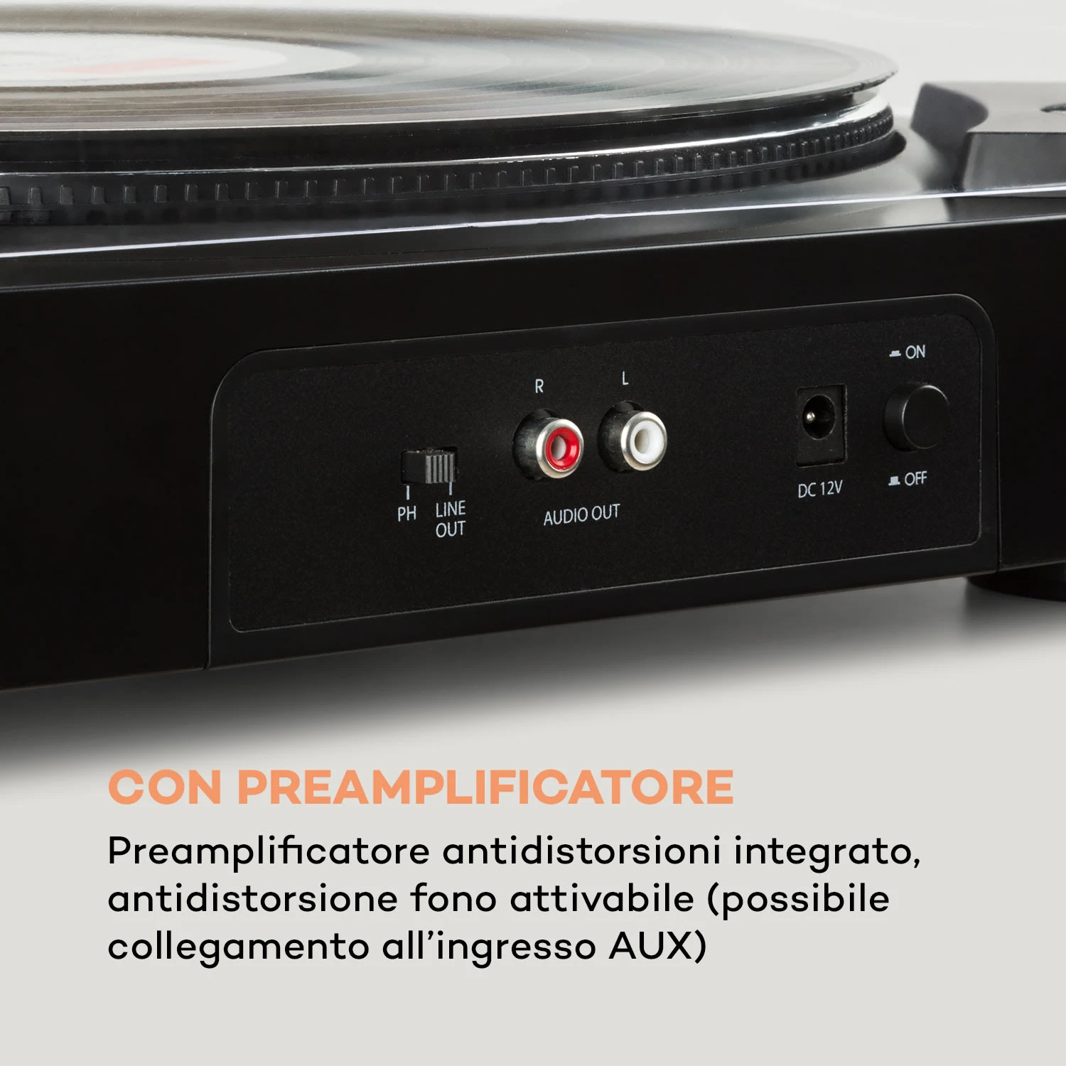 Inoltre, il giradischi consente la registrazione e la conversione di dischi in MP3: basta inserire una chiavetta USB e registrare su di essa il relativo disco. Il disco convertito in formato MP3 può ora essere riprodotto su PC o dispositivo mobile.