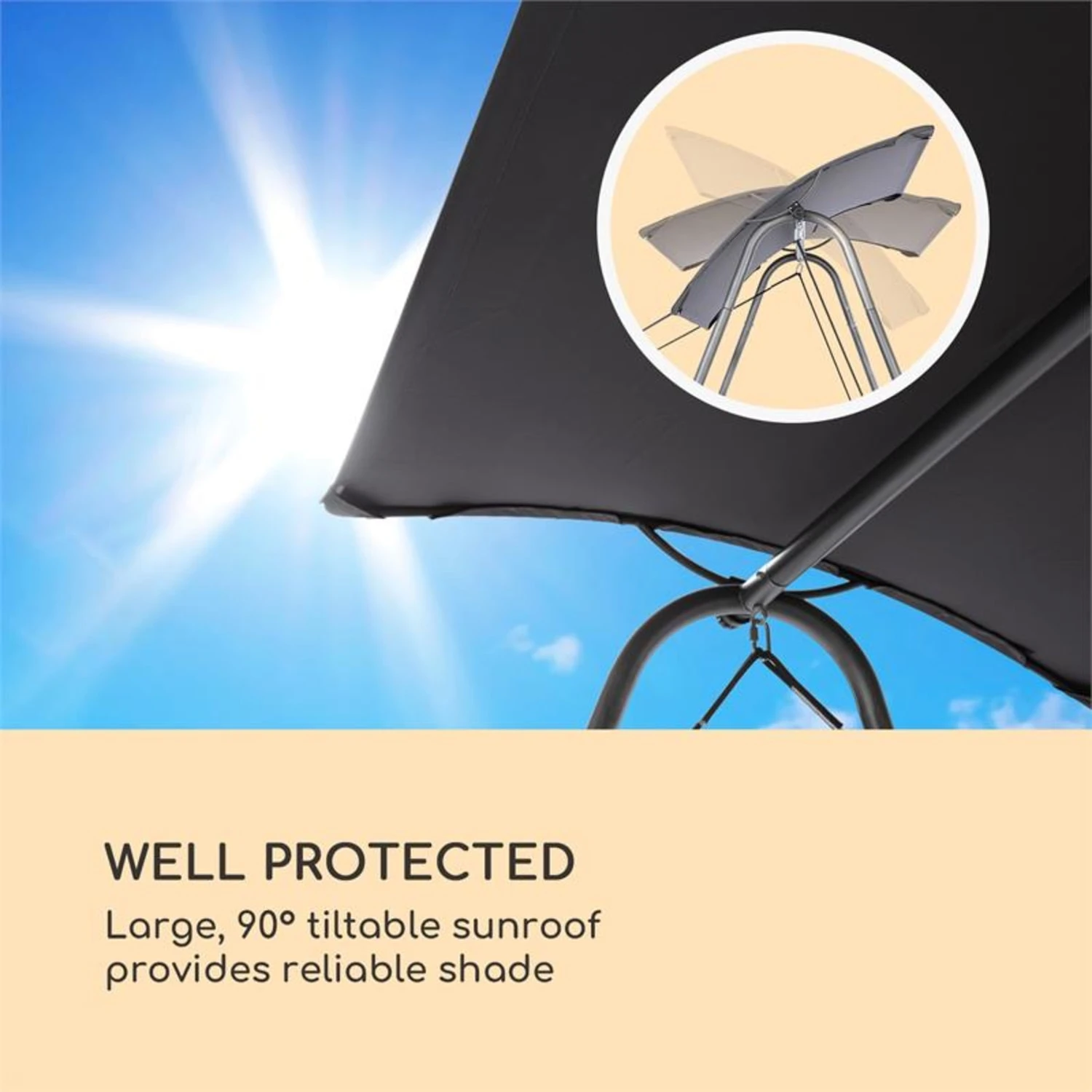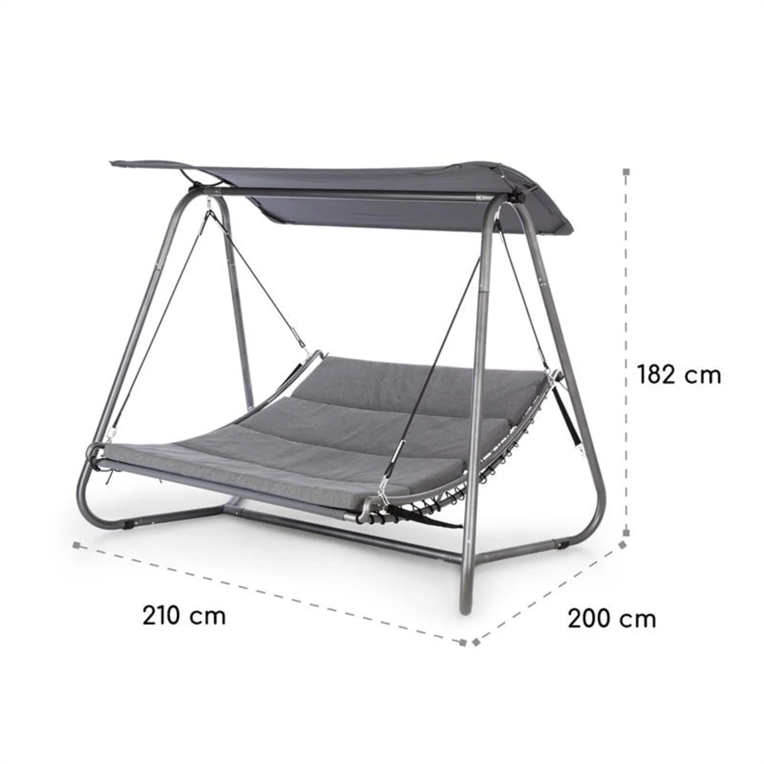 Il robusto telaio in acciaio rivestito a polveri dona grande stabilità alla sdraio a dondolo Garden Grove di Blumfeldt. La superficie con imbottitura spessa 6 cm e rivestimento rimovibile e lavabile non è solo resistente, ma con 148 x 200 cm (LxP) offre anche tranquillamente spazio per 2 persone. Due robuste funi permettono un rilassante dondolio, in modo che abbiate la sensazione di librarvi nell’aria quando vi accomodate su Garden Grove. L’ampio parasole garantisce ombra anche in caso di giornate molto soleggiate. Le viti in acciaio inox assicurano la lunga durata della struttura, che nonostante l’incredibile stabilità pesa solo 30 kg.