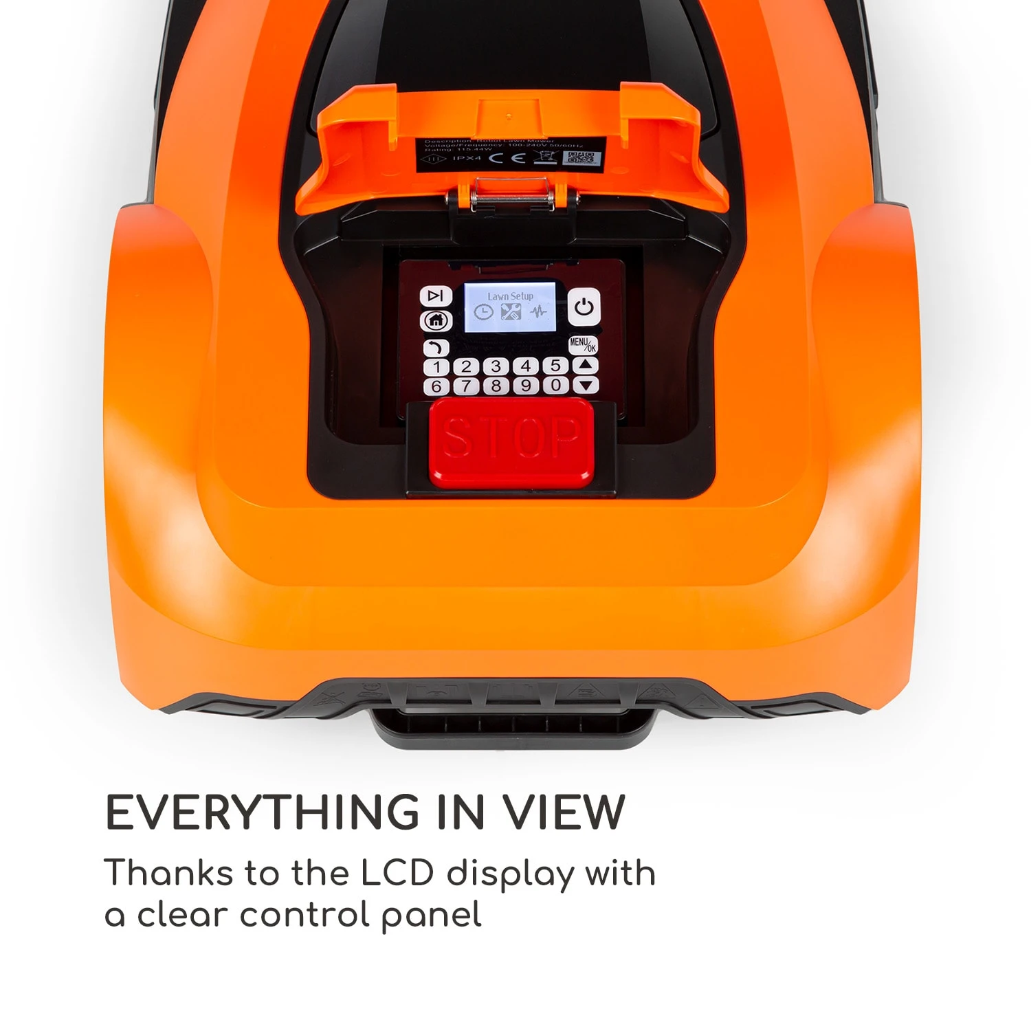 Il cavo perimetrale sistemato nel terreno circonda la superficie da tagliare: all’interno di quest’area il robot tagliaerba compie il suo lavoro. Le superfici di medie e grandi dimensioni fino a un massimo di 1.200 m² e le pendenze fino a 30° non sono più un problema. Inoltre la sua potente batteria dura fino a 3 ore, prima di recarsi automaticamente verso la stazione di ricarica. Dal pannello di controllo intuitivo con display LCD è possibile impostare numerose funzioni, come ad esempio i programmi “Casuale”, “Lungo i bordi”, “Spirale” e “Zig zag”. Quest’ultimo convince grazie al ZigZag Cutting System con una traccia a zig zag uniforme per un risultato particolarmente scrupoloso.