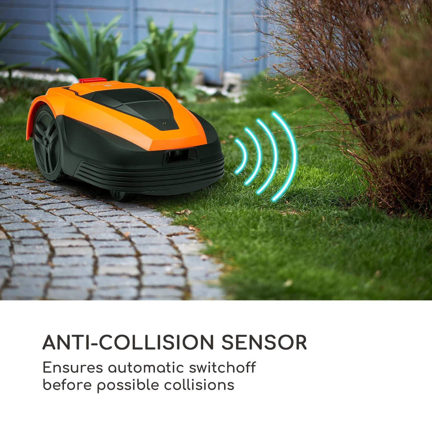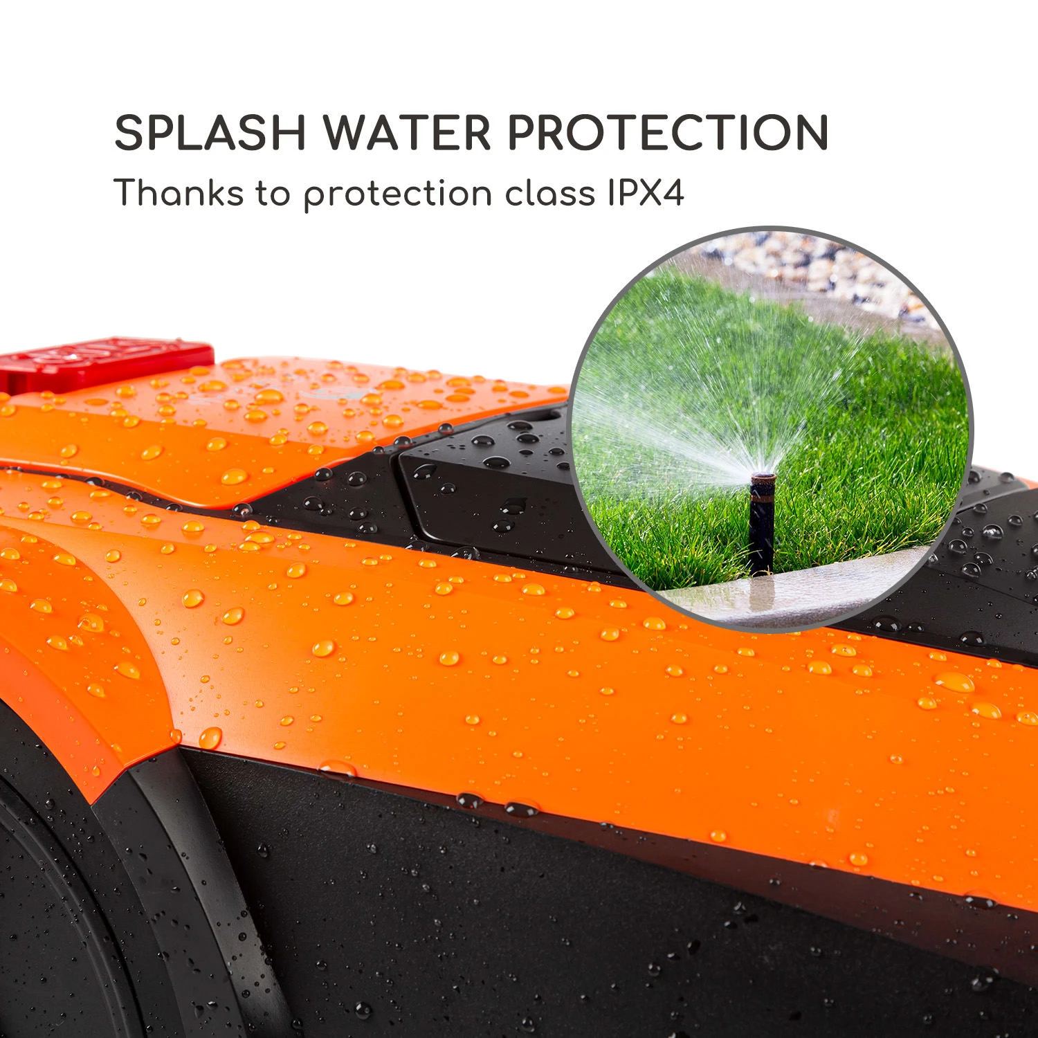 I sensori di sollevamento e inclinazione assicurano un fattore di protezione affidabile, perché le lame si spengono immediatamente non appena il robot tagliaerba viene sollevato o inclinato troppo. Il sensore di anticollisione si attiva nel momento di un possibile urto con oggetti: il Garden Hero si gira per proseguire in un’altra direzione. Inoltre il robot tagliaerba procede senza problemi su ogni prato grazie al suo profilo outdoor ed è protetto contro gli spruzzi d’acqua grazie al grado di protezione IPX4.