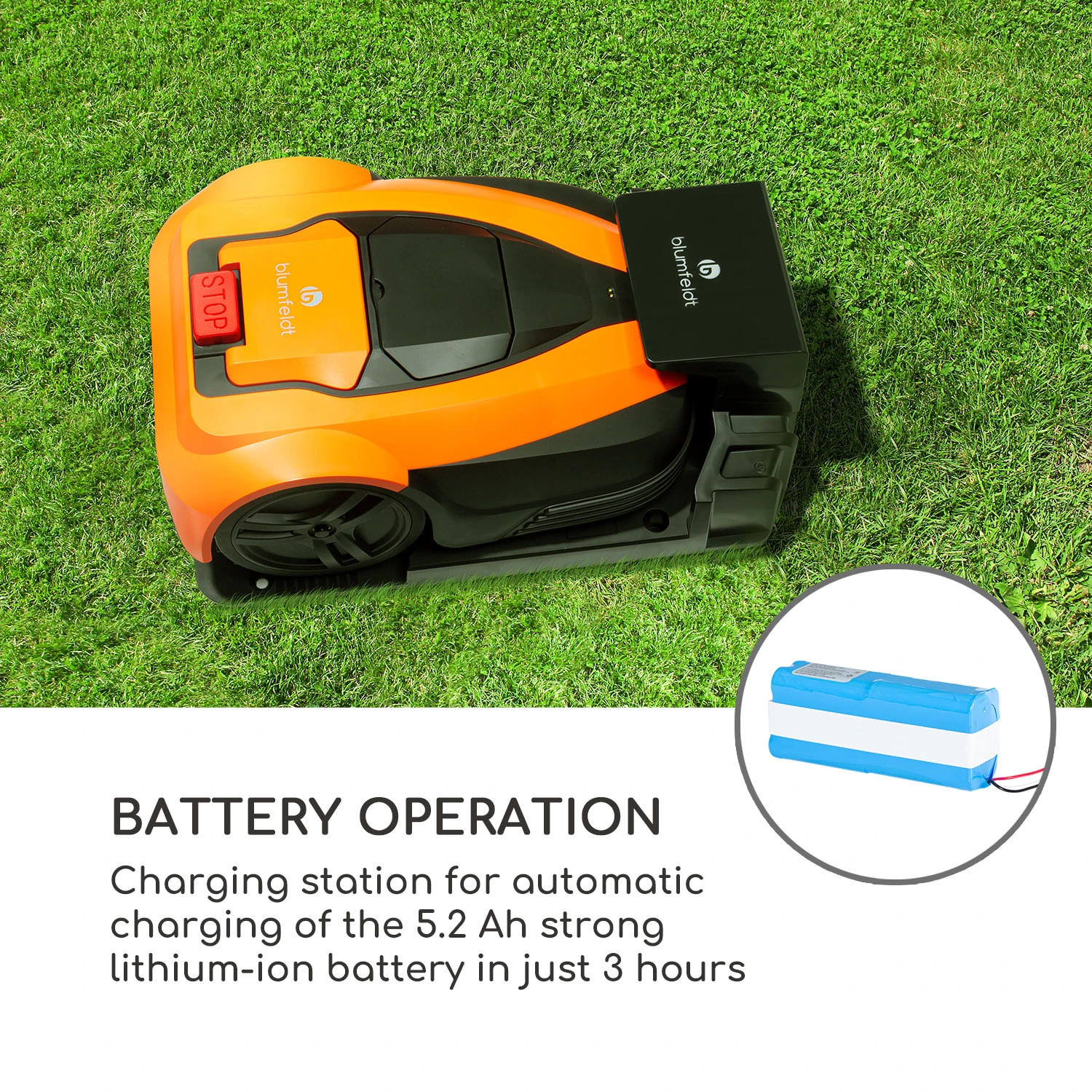 Grazie alla lunga durata della batteria e alle molteplici possibilità di regolazione, il robot tagliaerba Garden Hero di Blumfeldt garantisce vistosi prati tagliati scrupolosamente.
