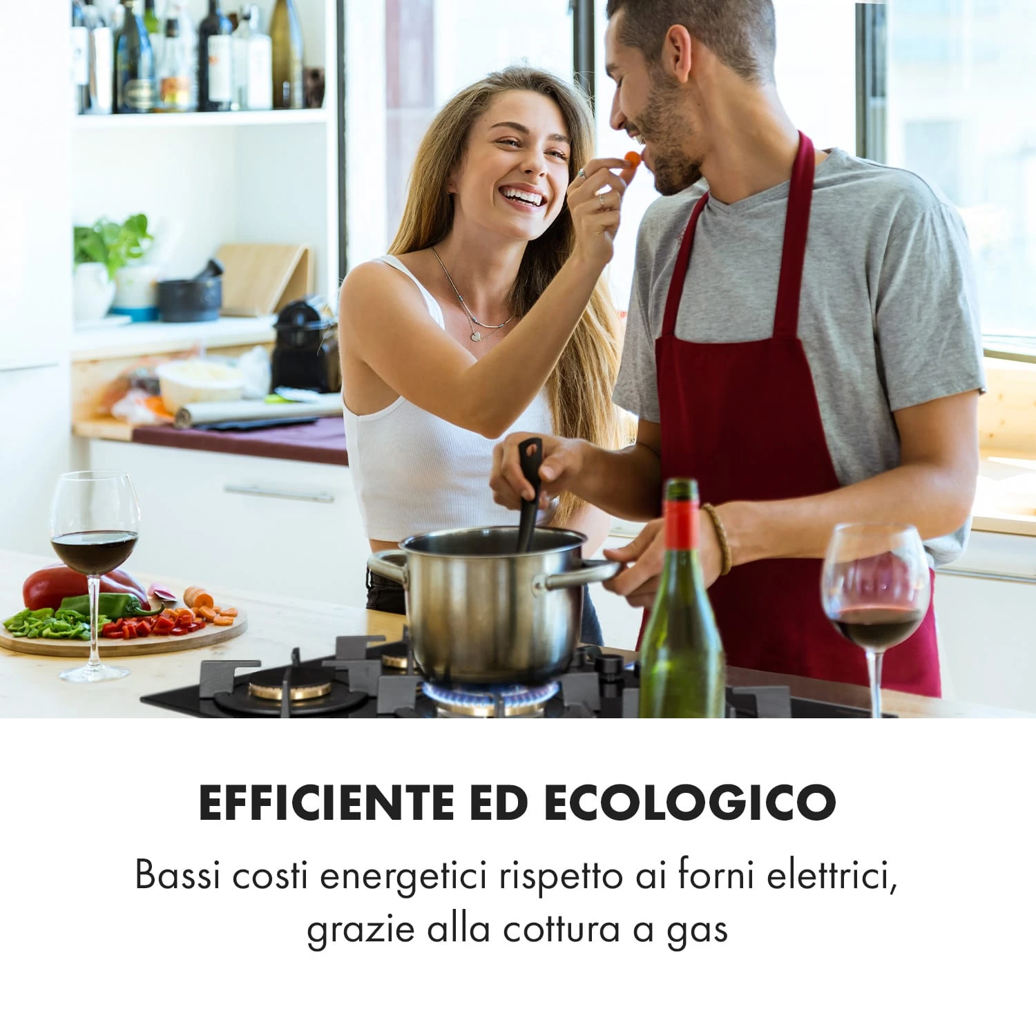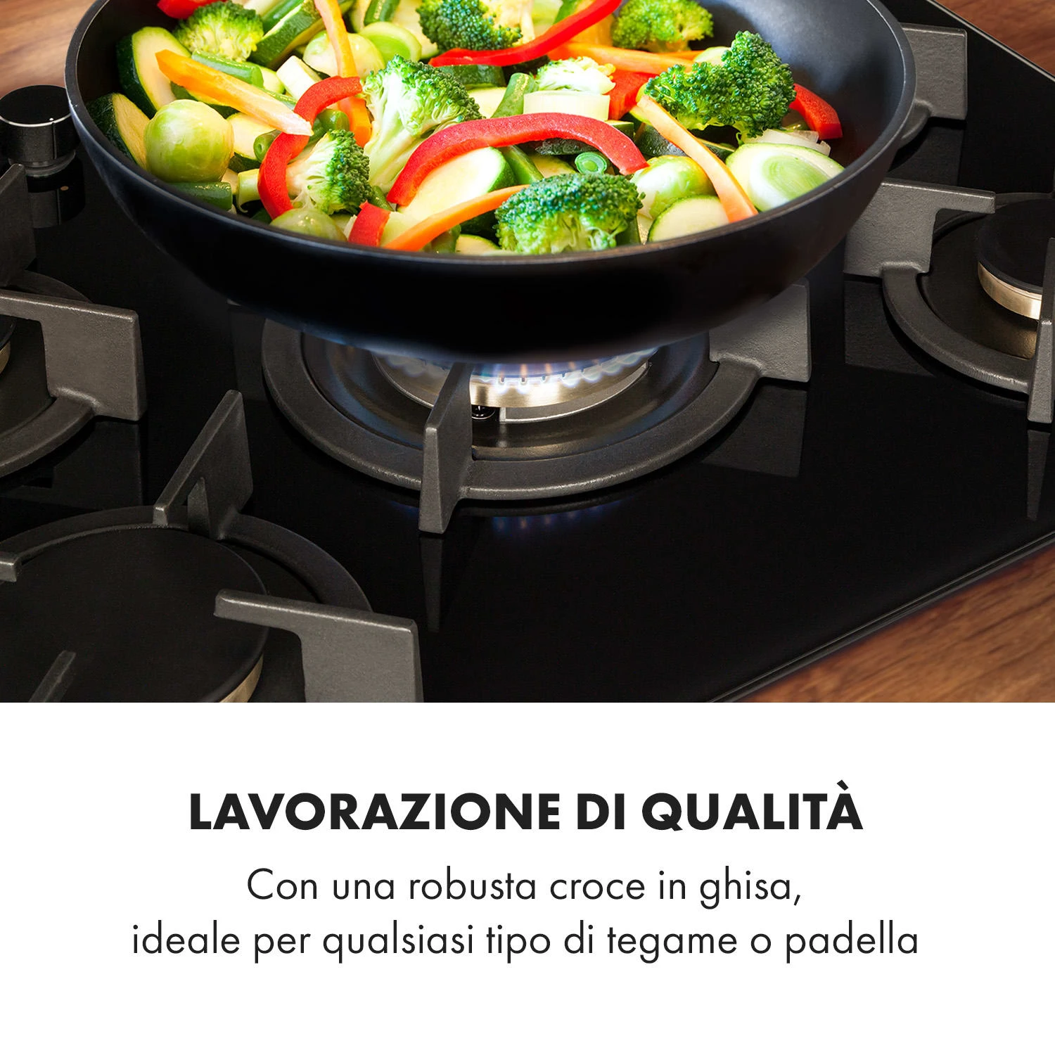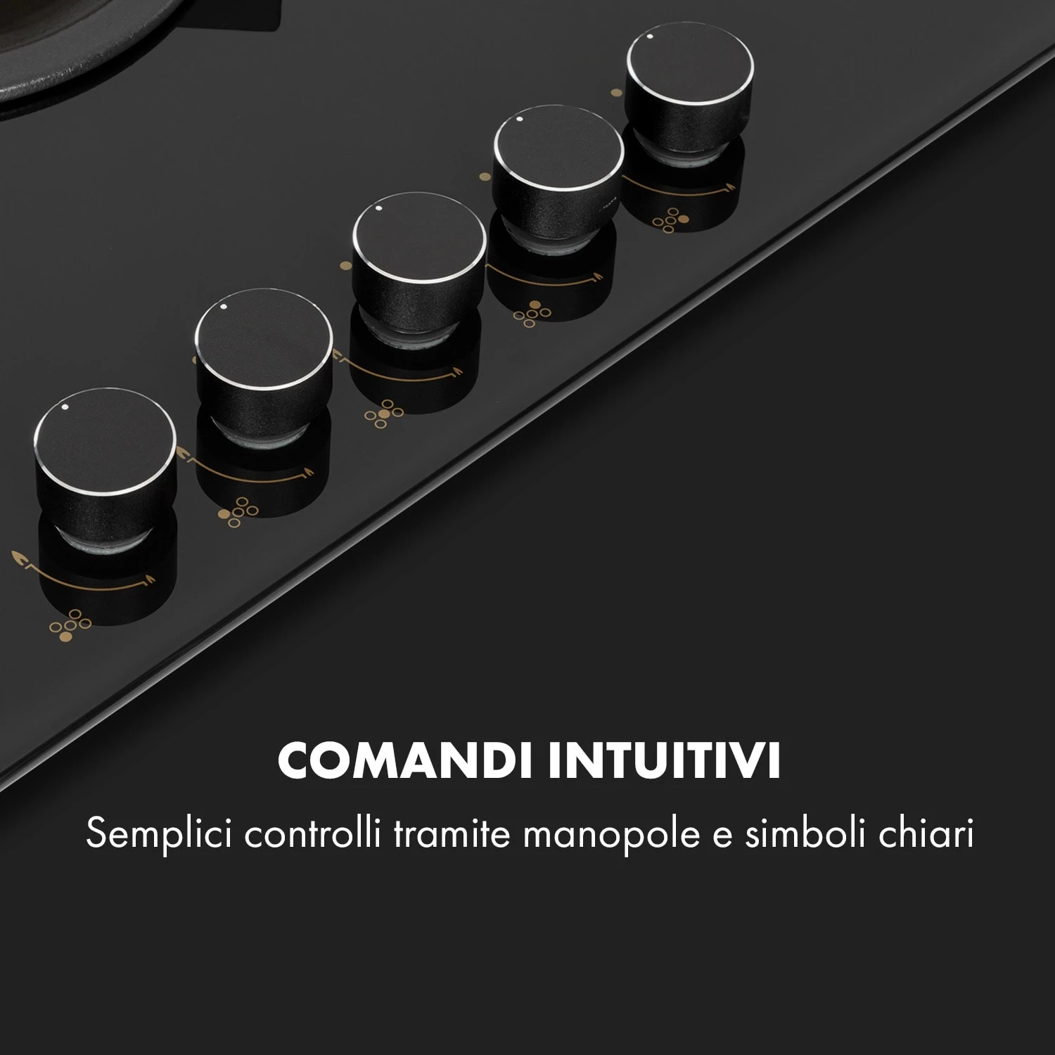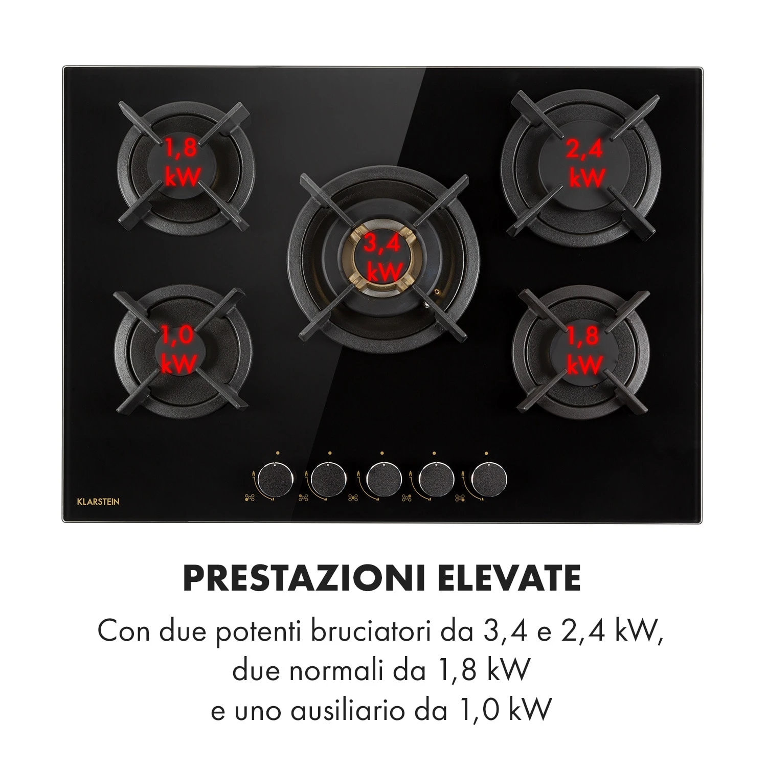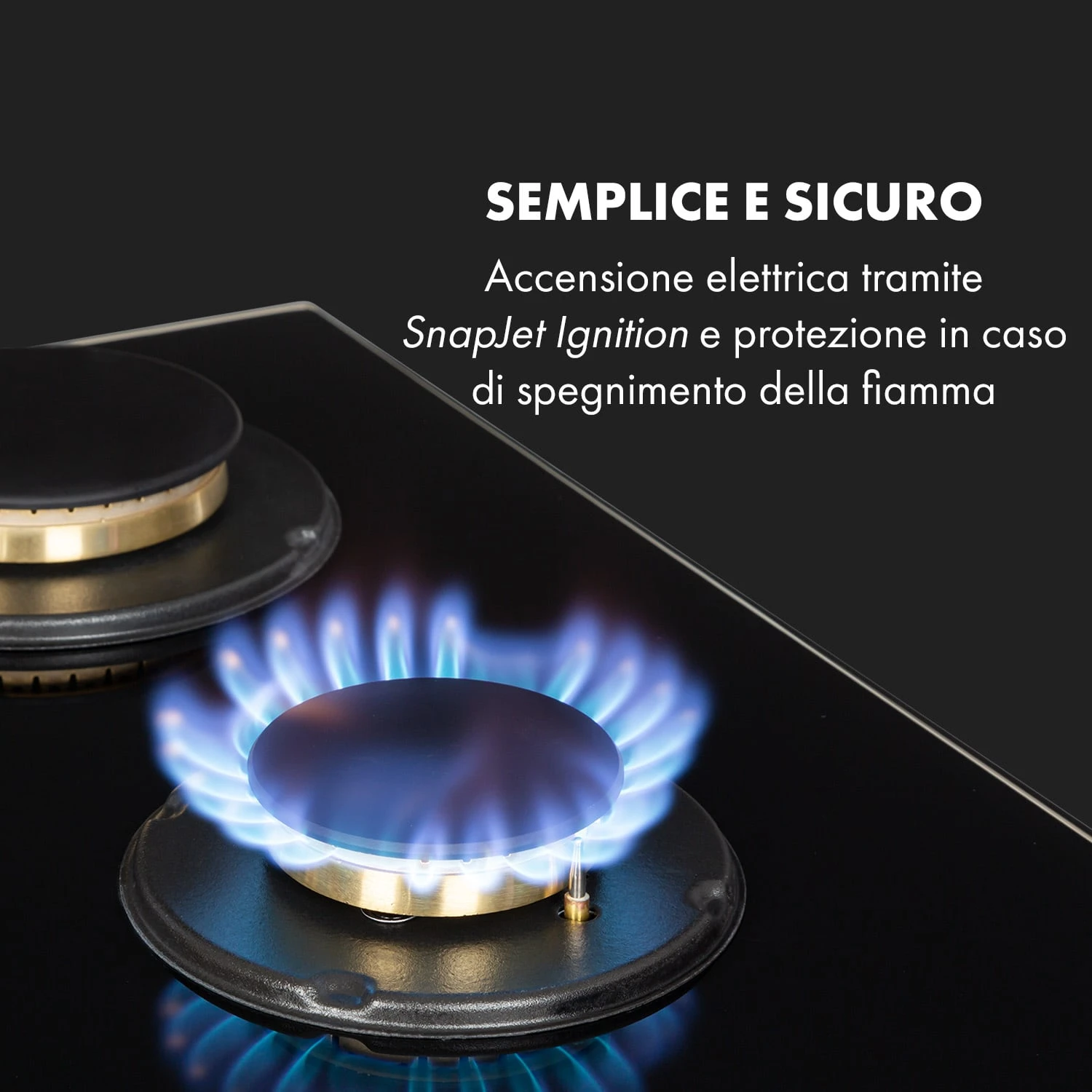 Sul piano cottura Goldflame di Klarstein si trovano cinque bruciatori d’alta qualità, che riscaldano a una potenza di 3,4 kW, 2,4 kW, 2 x 1,8 kW e 1,0 kW. Come suggerisce già il nome, abbiamo scelto per la serie Goldflame dei bruciatori d’ottone d’alta qualità, dato che non hanno solo un aspetto pregiato, ma durano molto più a lungo rispetto ai bruciatori d’alluminio tradizionali e garantiscono una miglior distribuzione del calore sul piano cottura: una differenza che puoi vedere e toccare. Tutti i bruciatori distribuiscono il calore uniformemente verso il centro e i bordi delle pentole o padelle. Tutto viene cotto alla perfezione e nel miglior modo possibile. La griglia a croce in ghisa massiccia è adatta a quasi tutti i tipi di stoviglie e calza perfettamente sopra le fiamme senza pericolo di ribaltarsi. Grazie ai simboli identificativi posti sulle manopole l’utilizzo è facilissimo. E’ possibile regolare continuamente l’apporto di calore durante la cottura. Questo è il grande vantaggio dei fornelli a gas: le modifiche apportate alle dimensioni della fiamma si ripercuotono immediatamente sulla temperatura delle pentole o padelle. Ovviamente abbiamo anche pensato alla sicurezza ai fornelli: non è necessario impiegare un altro meccanismo per l’accensione. La fiamma del gas si ravviva semplicemente grazie al sistema SnapJetIgnition. La protezione contro l’estinzione di fiamma interrompe l’apporto del gas al bruciatore, nel caso la fiamma dovesse estinguersi per qualsiasi motivo.