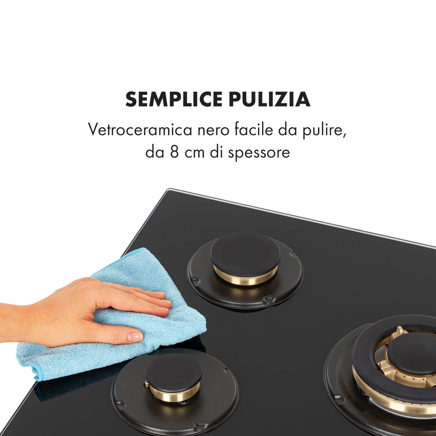 Il piano cottura a gas si pulisce facilmente dopo aver cucinato: per questo motivo ha una superficie in vetroceramica nera temprata da 8 mm facile da pulire. Non solo ha un aspetto incredibile, ma è anche di semplice manutenzione.