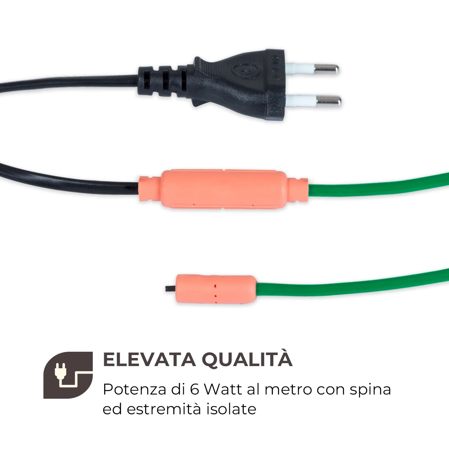 Il cavo riscaldante da 6 m dispone di una linea d’alimentazione da 1,80 m con spina schuko. Inoltre è anche antipolvere e impermeabile secondo il grado di protezione IP68. La connessione finale e centrale è rivestita da un isolamento di plastica per garantire un funzionamento sicuro.