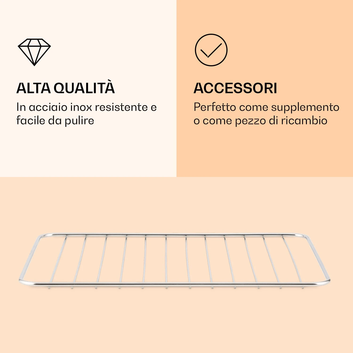Sulla griglia della friggitrice ad aria calda AeroVital Jumbo di Klarstein potrai grigliare carne, verdure e salsicce. La griglia è interamente in acciaio inossidabile. Grazie alla sua superficie liscia, non solo si rivela estremamente duratura ma facile da lavare.