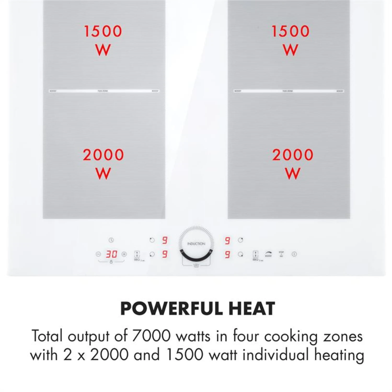 Delle quattro zone cottura con una potenza totale di 7000 W, due si combinano in una zona flex secondo il principio VarioHeating. Grazie al riconoscimento della pentola si adattano alle dimensioni delle stoviglie. Tutti i campi possono essere regolati separatamente e dispongono di una funzione ThermoBoost per una cottura più veloce. L’utilizzo del piano cottura in vetroceramica Delicatessa 60 di Klarstein è semplice grazie al pannello touch integrato SenseControl con regolazione Touch-to-slide per controllare la potenza e display digitale. Per far sì che la cottura si svolga senza intoppi, il fornello a incasso possiede diversi dispositivi di sicurezza: protezione da surriscaldamento con spegnimento automatico, indicatore del calore residuo, funzione ThermalRecall e chiusura di sicurezza per bambini.