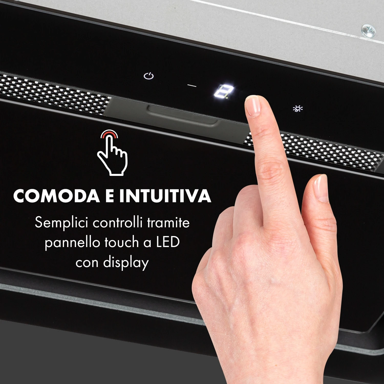 La cappa aspirante da incasso Hektor Eco di Klarstein garantisce aria pulita nella tua cucina grazie al suo motore da 200 Watt con funzione di scarico. Le 2 lampade a LED da 2 Watt illuminano perfettamente il piano cottura, in modo da avere sempre sott’occhio le pentole e le padelle. Tre livelli di potenza offrono fino a 566 m³/h di capacità aspirante permettendo di adattare la potenza in base a ciò che si cucina. Il piatto forte della cappa aspirante da incasso Hektor Eco da 52 x 32 cm (LxP) è la capacità di scomparire completamente nella tua cucina. A differenza della maggior parte delle cappe da incasso, sparisce senza lasciare traccia nei pensili della cucina sopra i fornelli e mostra solamente il suo elegante lato inferiore in vetro di sicurezza nero. Qui si cela anche il pannello di controllo touch, con cui è possibile gestire con grande facilità ventilazione, illuminazione e timer. Il timer di spegnimento aspira da 1 a 9 minuti prima che il dispositivo si spenga da solo. Il filtro antigrasso integrato si smonta con facilità e si pulisce semplicemente con acqua e un po’ di detersivo per piatti.