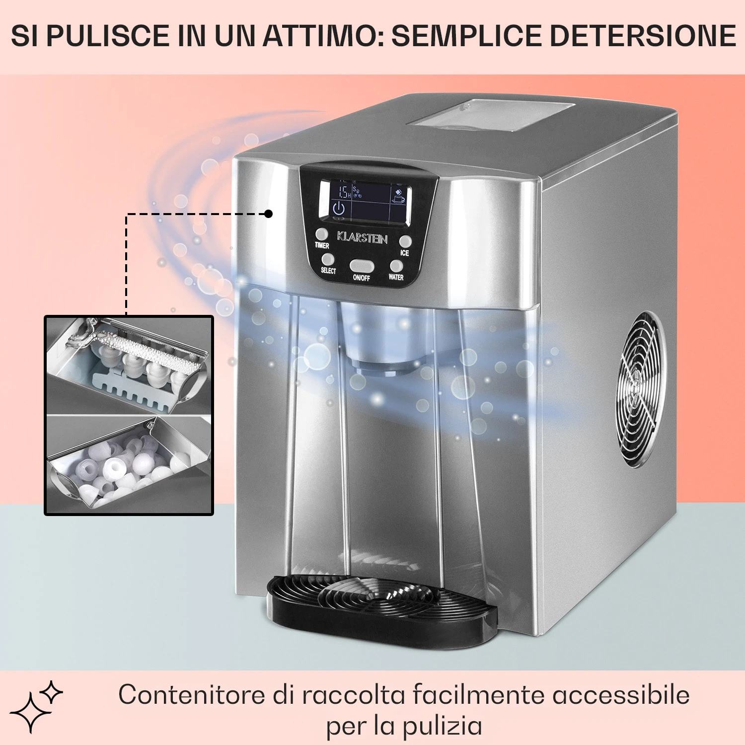 La macchina per ghiaccio Ice Volcano 2GS di Klarstein è molto semplice da gestire tramite il pannello di controllo intuitivo con display LCD luminoso e controllo soft touch. Pasta premere pochi pulsanti per avviare o interrompere la programmazione del timer – così la produzione di ghiaccio inizierà e terminerà quando lo desiderate. Il dispositivo è dotato di una tecnologia di raffreddamento ultra moderna, in grado di operare in maniera silenziosa per non interferire con l’atmosfera delle vostre feste. I materiali neutri impiegati per la struttura della macchina non interferiscono in alcun modo con il gusto dei cubetti prodotti.