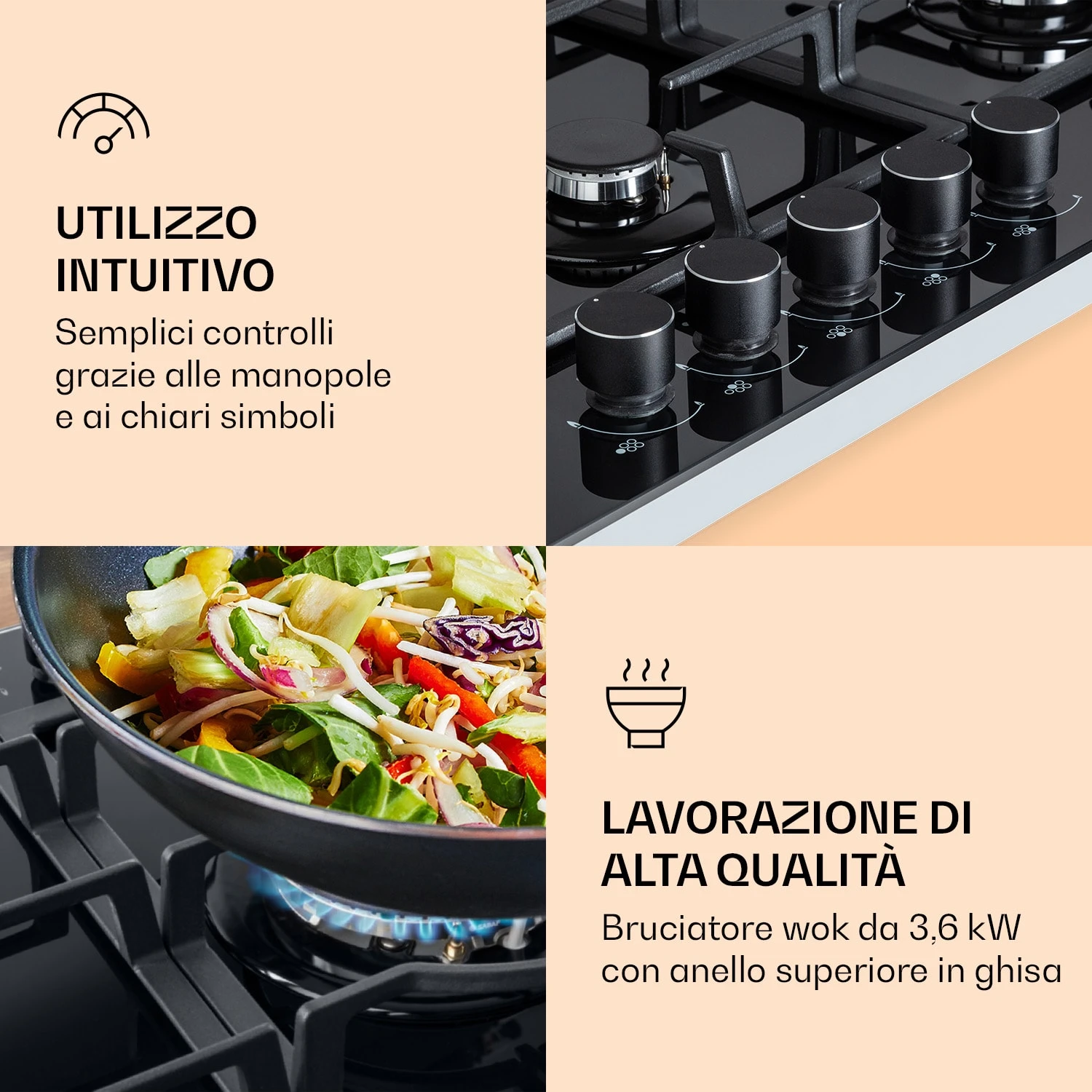 Dopo la cottura, il piano cottura a gas è praticissimo da pulire grazie al rivestimento in vetroceramica temperato. Non ha solo un aspetto stupendo, ma assicura anche una cura facilissima.