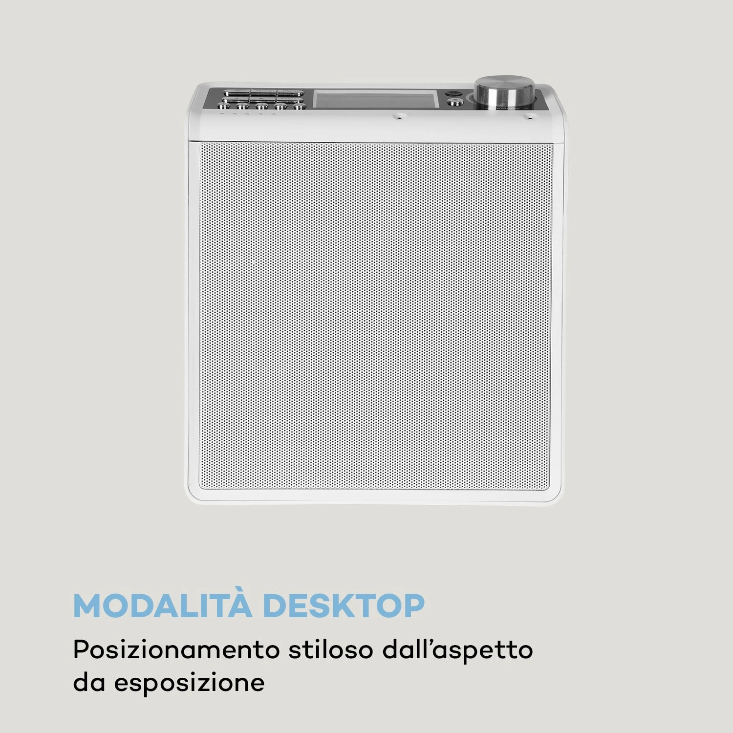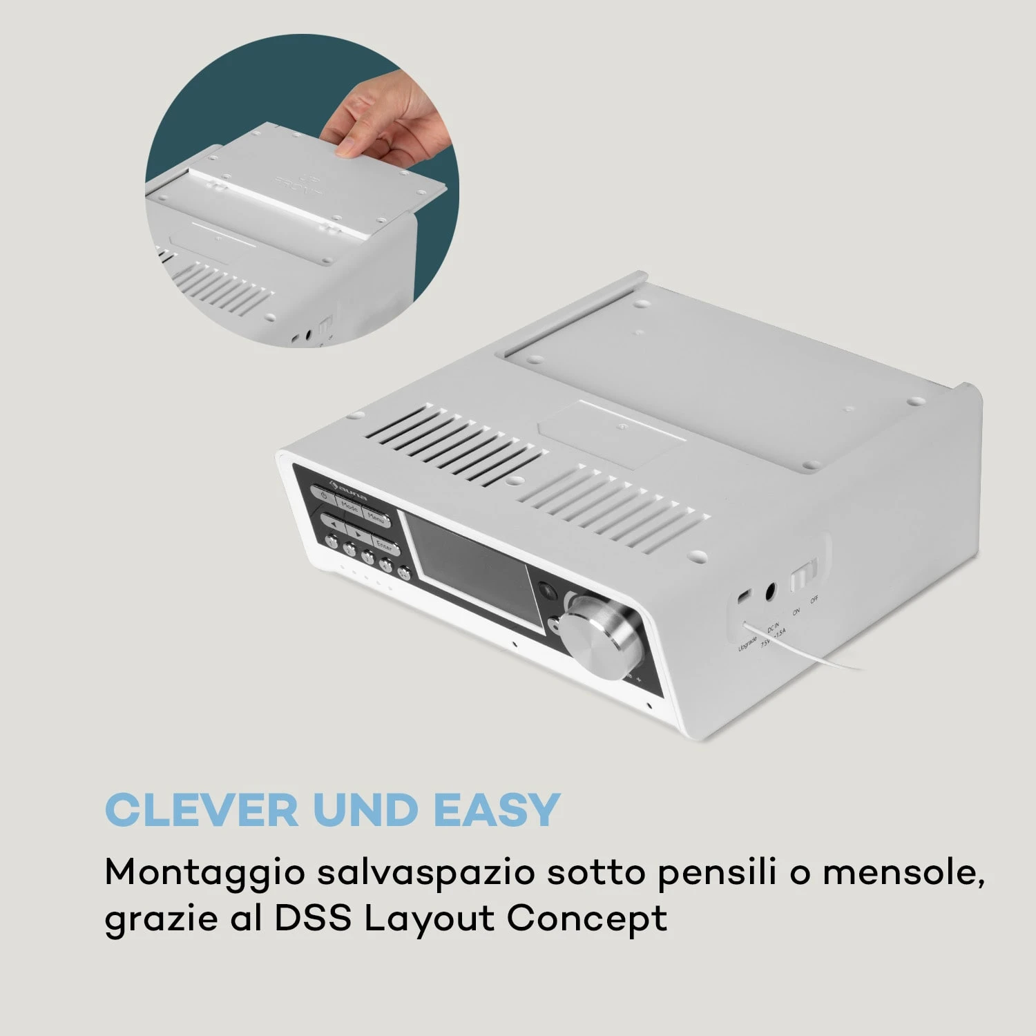 La versatile radio DAB + / FM con 5 watt RMS può essere montata sotto gli armadi da cucina e gli scaffali per risparmiare spazio grazie alle sue dimensioni compatte e al concetto di installazione intelligente e duplice, e posizionata in modalità desktop. La cassa armonica con antenna DAB + e FM integrata riceve in aggiunta al segnale analogico tutti i trasmettitori digitali e privi di rumore.