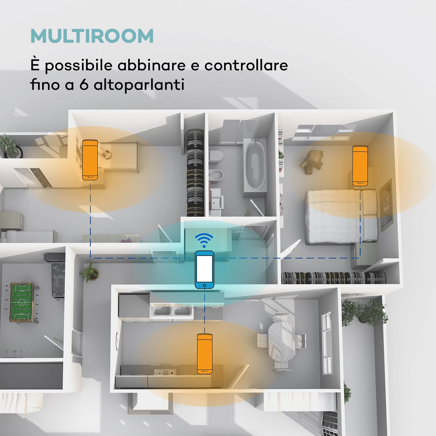 Grazie al controllo tramite app, l’altoparlante Intelligence Tube di auna può essere gestito da smartphone, tablet o notebook. La funzione Multiroom permette inoltre di collegare fino a 6 altoparlanti Intelligence Tube. Così è possibile distribuire in casa gli altoparlanti, gestendoli con una sola app. Lo standard IPX4 rende Intelligence Tube idrorepellente e dunque perfetto per essere utilizzato in bagno, rilassandosi in vasca con le vostre canzoni preferite in sottofondo.