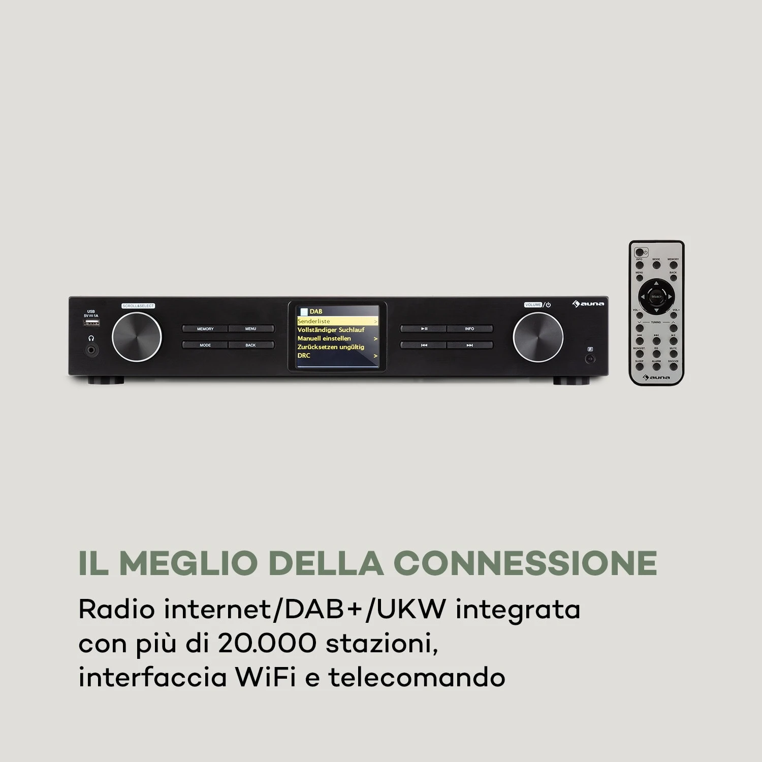 L’HiFi Tuner digitale iTuner 320 BT di auna offre un ampio spettro di potenziali fonti audio e numerose funzioni. Il sintonizzatore per web radio può essere collegato direttamente con il servizio di streaming di Spotify o può accedere a oltre 20.000 emittenti radio web. Nell’equipaggiamento troviamo una funziona ancora unica per un HiFi Tuner digitale, cioè il Bluetooth per streaming da smartphone, tablet o laptop e un sintonizzatore DAB+/FM con funzione RDS per informazioni aggiuntive sulle emittenti. In questa enorme offerta di emittenti si trovano un sacco di generi musicali diversi e notizie da tutto il mondo. La potente antenna WLAN permette all’HiFi Tuner digitale iTuner 320 BT di auna di riprodurre musica in streaming in tutta la casa e di controllarla con smartphone o tablet tramite la app UNDOK. Un telecomando è incluso con l’HiFi Tuner digitale iTuner 320 BT di auna. Il supporto di DLNA e UPnP permette il rapido collegamento di tuner compatibili a WiFi in tutta la rete casalinga. Il tuttofare mette anche a disposizione una porta USB frontale, mentre sul retro si trovano connessioni analogiche e digitali. Grazie a queste connessioni, l’HiFi Tuner digitale iTuner 320 BT di auna può essere integrato in un impianto stereo già presente. Al centro del lato frontale, con look ispirato all’alluminio spazzolato, si trova un display HCC. Questo display a colori rende ancora più facile l’utilizzo intuitivo del dispositivo. L’HiFi Tuner digitale iTuner 320 BT di auna è concepito per essere integrato in impianti HiFi con formato da 43 cm. Per connettere gli altoparlanti necessari, l’HiFi Tuner digitale iTuner 320 BT di auna mette a disposizione un grande repertorio di collegamenti.