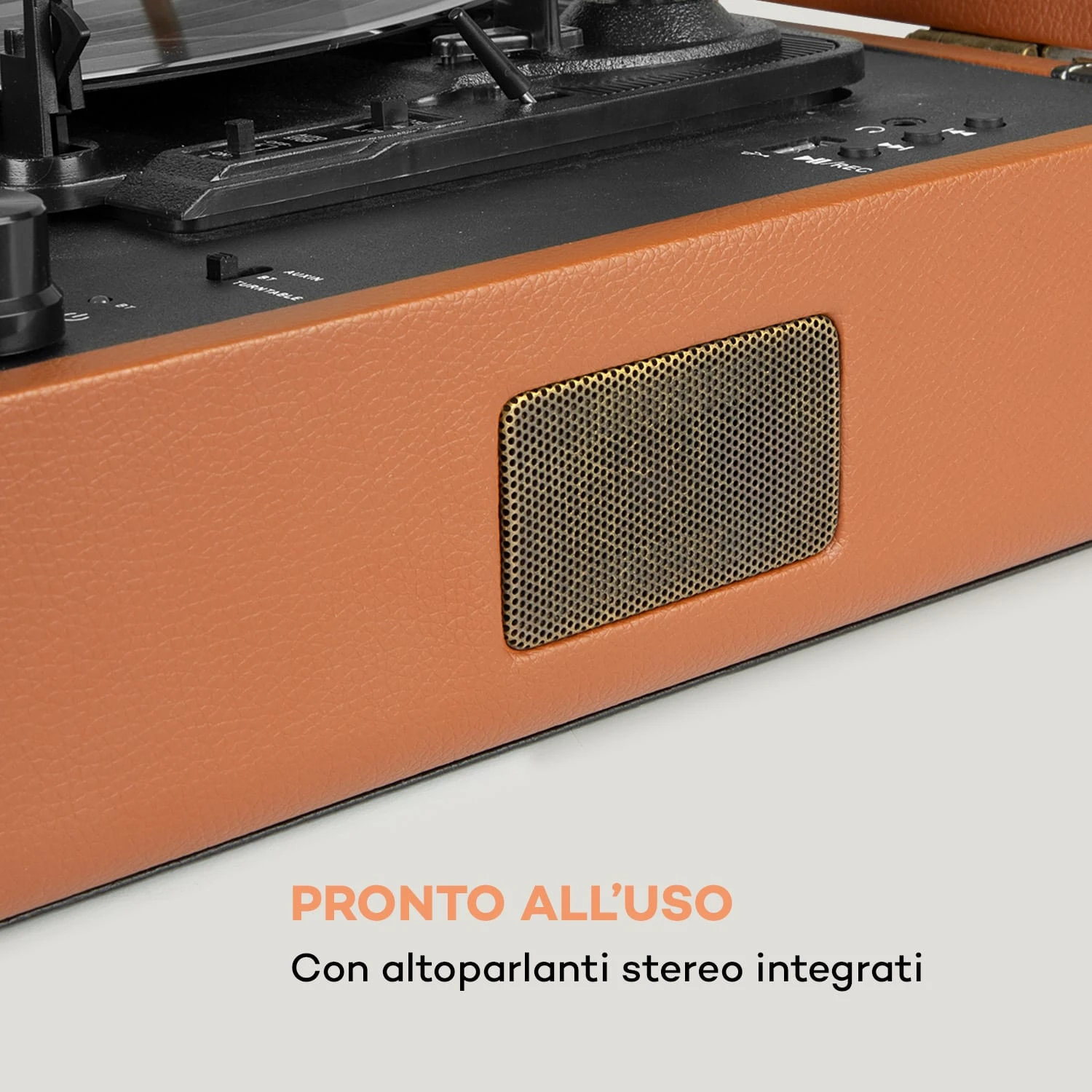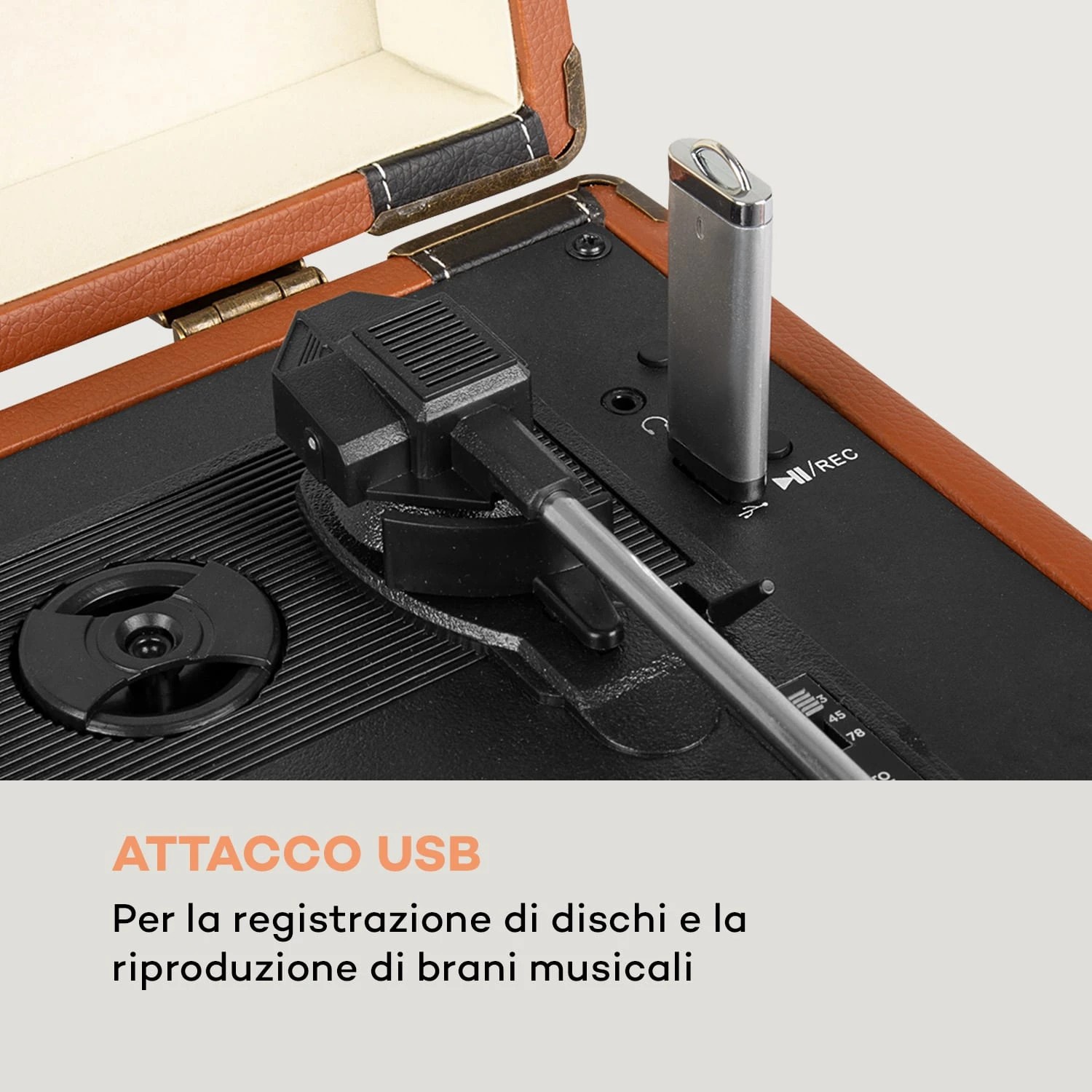 Il giradischi è subito pronto per l’uso: gli altoparlanti stereo sono già integrati nella sua valigetta compatta. All’uscita stereo Cinch posizionata sul retro si possono collegare in aggiunta degli altoparlanti esterni o un impianto Hi-Fi. La funzione Bluetooth consente la riproduzione senza fili di tutti i segnali audio di smartphone, tablet o laptop. Le fonti musicali esterne possono anche essere collegate via cavo tramite l’ingresso AUX sul retro dell’apparecchio. Il volume viene regolato in modo continuo tramite la manopola posizionata all’interno del giradischi. Sul piatto del giradischi si possono sistemare fino a tre diverse dimensioni dei dischi (33, 45 e 78 giri/min), che girano facilmente grazie alla trasmissione a cinghia. Inoltre il Jerry Lee BT consente di incidere comodamente i dischi con una penna USB. Grazie al collegamento USB, sul giradischi si possono riprodurre anche brani musicali dai lettori MP3 o dalle penne USB. La presa degli auricolari permette a qualsiasi ora del giorno una diffusione sonora discreta e diretta. L’ideale quando si vuole tirar tardi accompagnati dall’atmosferico crepitio dei dischi.