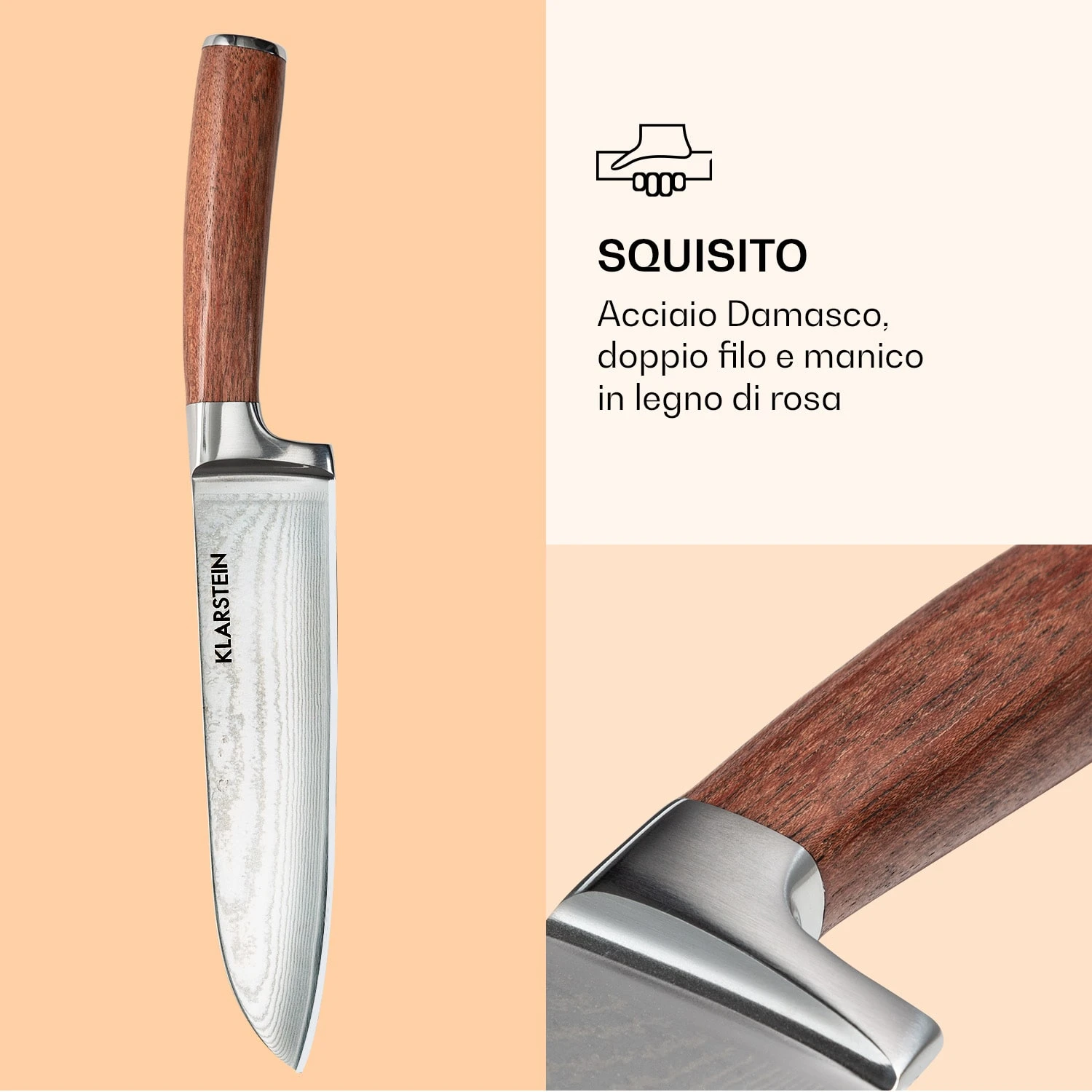 L’acciaio di Damasco nasce da una tradizione ultracentenaria, che fonde insieme diversi tipi di acciaio in un nuovo metallo. Questa lega di altissima qualità rende i coltelli Kaito di Klarstein esclusivi, durevoli e forti. Le lame di precisione dei coltelli sono composte da 67 strati dell’acciaio più raffinato e hanno il manico in legno di rosa. I coltelli di qualità sono un acquisto per la vita: le lame colpiscono per i bordi affilatissimi e la lucidatura a specchio dà loro il tocco finale.