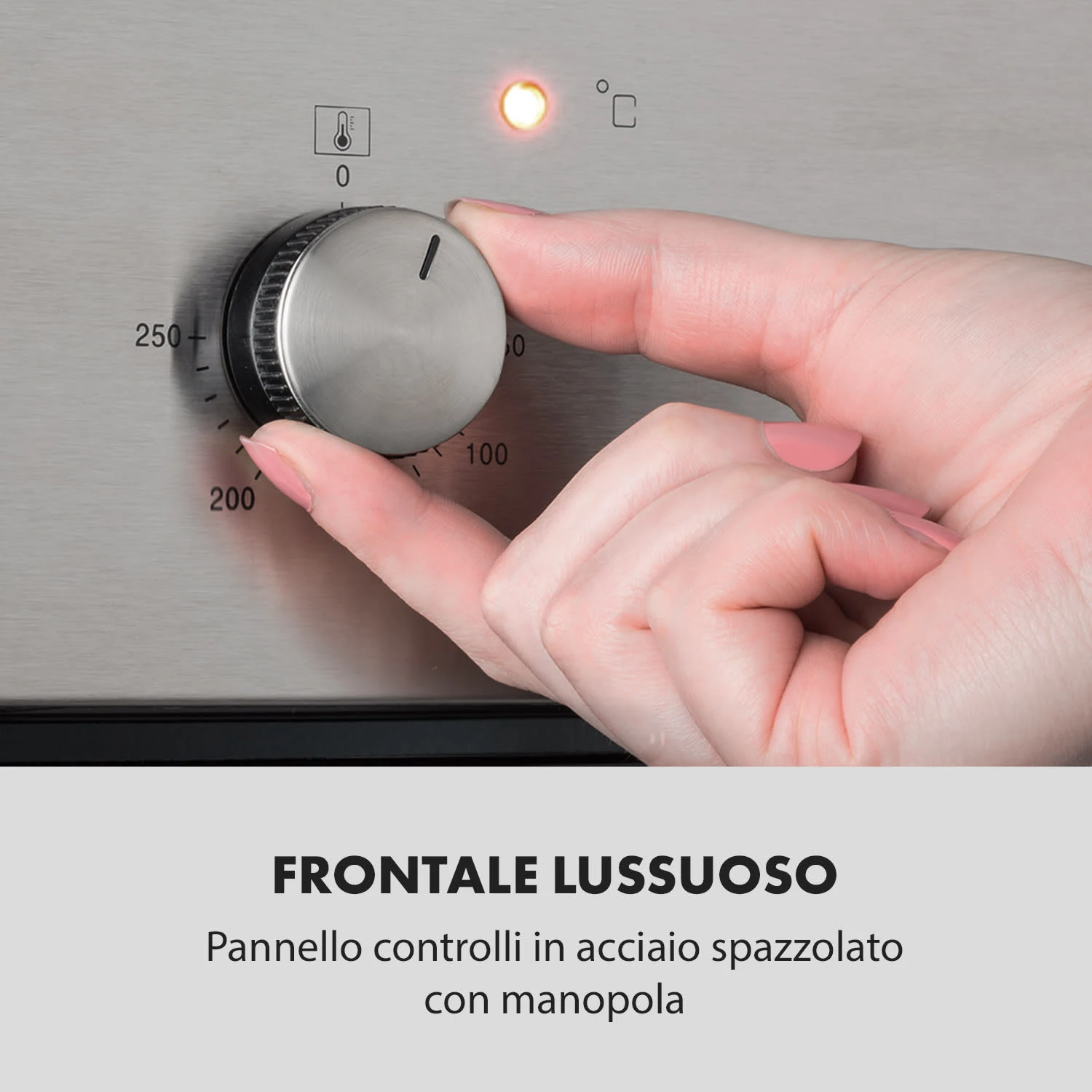 Con i 68 litri di spazio interno del forno da incasso Kalahari di Klarstein potrai preparare abilmente ed economicamente non soltanto dolci, timballi o pizze. Grazie alle sue 7 funzioni scongelamento, calore superiore e inferiore, ventilato, grill semplice o doppio, grill ventilato e calore inferiore ventilato soddisfa tutti i requisiti di una cucina semplice ed efficiente. Inoltre il forno da incasso Kalahari ha una modalità manuale con timer di cottura facile da usare e temperature selezionabili tra 50 e 250 °C. L’uso è intuitivo e comodo con il commutatore girevole.