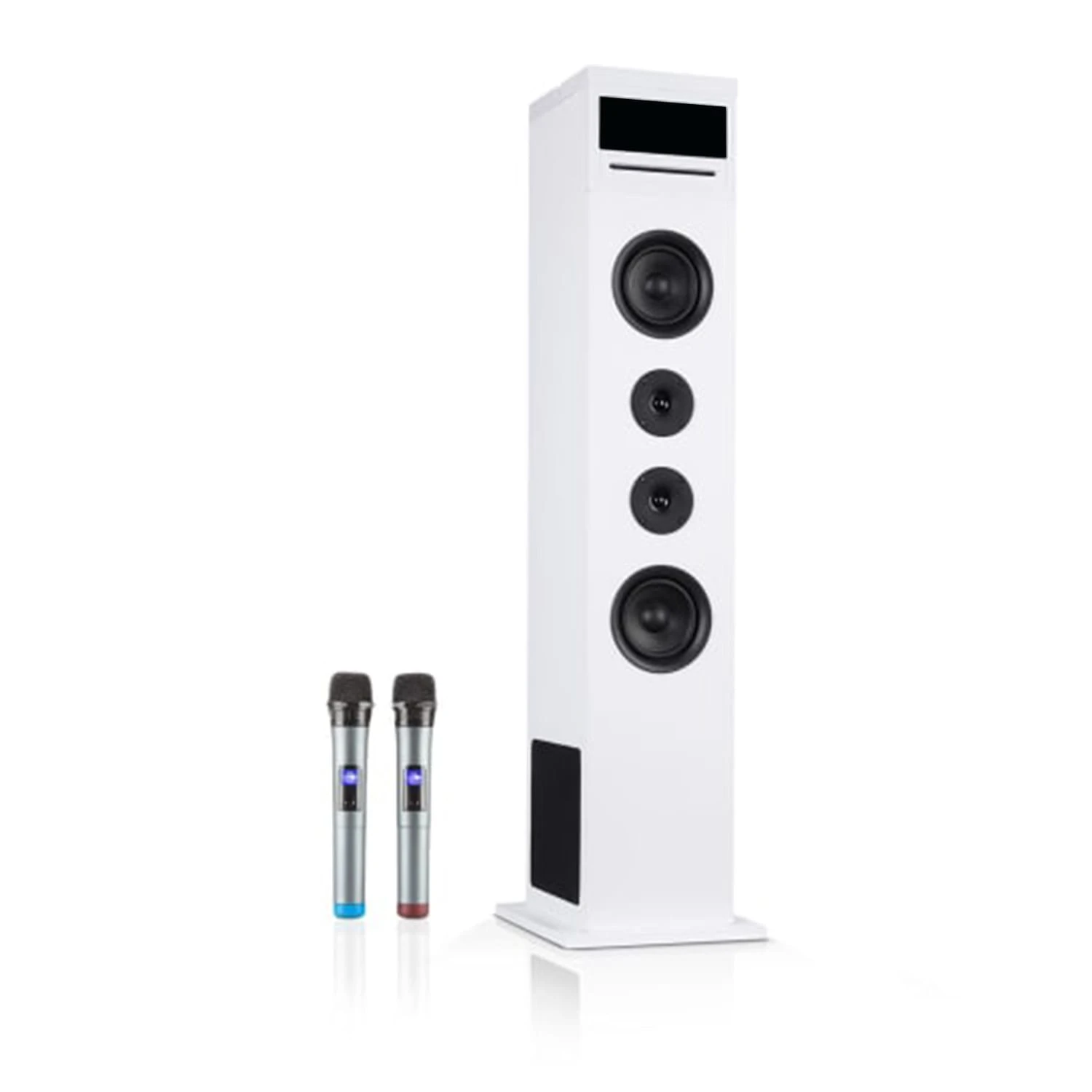Il diffusore da pavimento occupa poco spazio con il suo piccolo ingombro e si adatta a qualsiasi ambiente abitativo grazie al suo design chiaro. Particolarmente pratico: c’è un porta tablet sulla parte superiore. Anche uno smartphone può essere riposto in modo sicuro. Due microfoni senza fili sono inclusi nella consegna in modo che il karaoke party possa iniziare immediatamente: basta accendere un microfono, selezionare la modalità del dispositivo e iniziare a cantare!