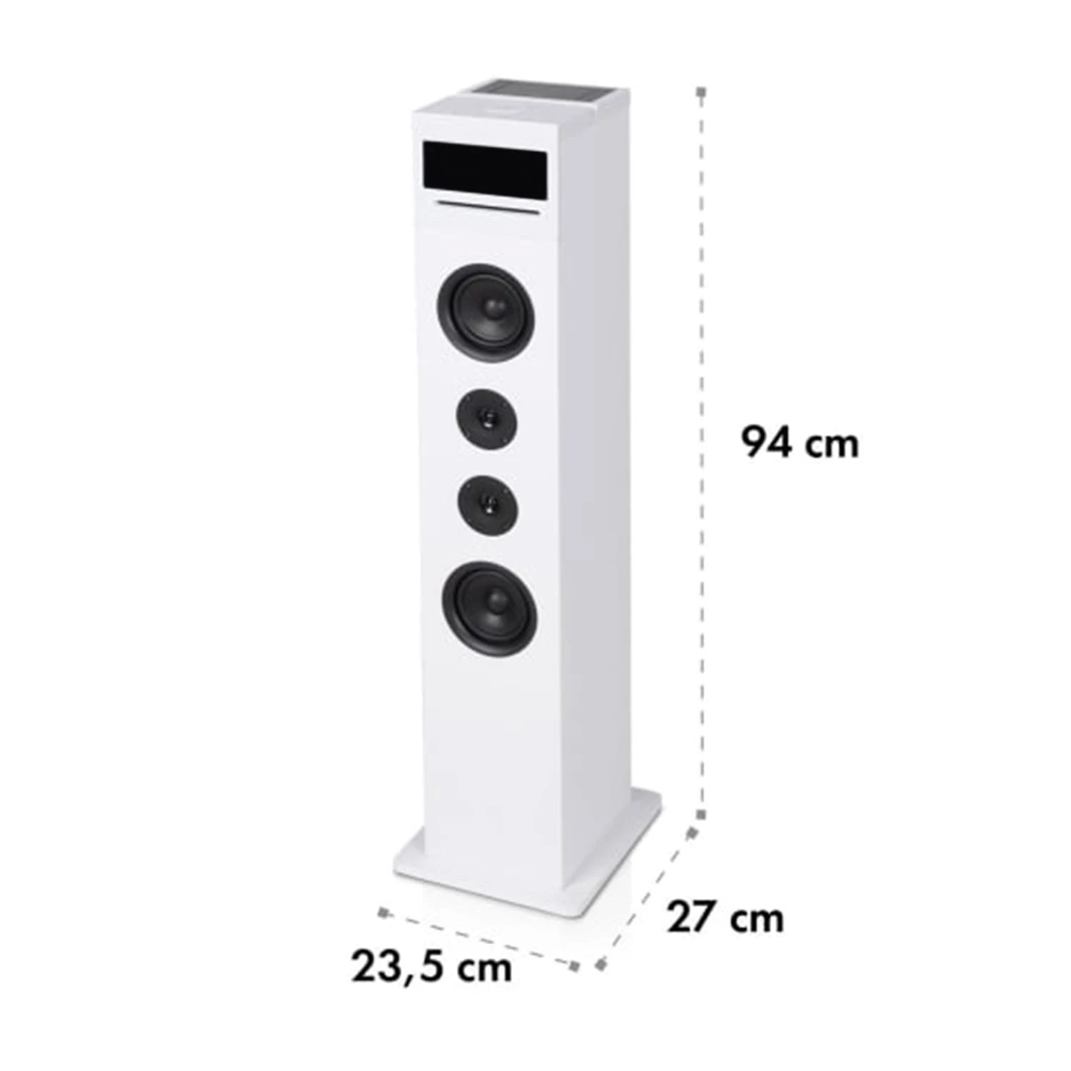 Con una potenza massima di 120 Watt, il contenuto musicale viene riprodotto con un suono potente attraverso il diffusore a torre Karaboom 100 Sing: il OneSide Subwoofer fornisce bassi notevolmente pieni e suoni che riempiono la stanza. Tutte le funzioni sono controllate sull’altoparlante stesso o comodamente tramite il telecomando. Grazie al display a LED, l’ora e gli artisti rimangono sempre in vista – è disponibile anche una funzione di allarme e snooze.