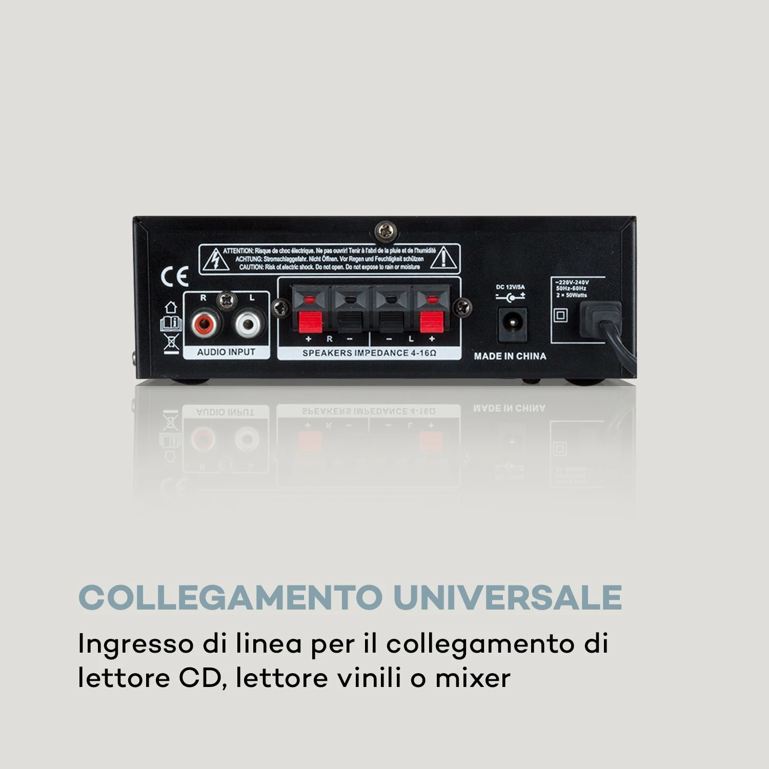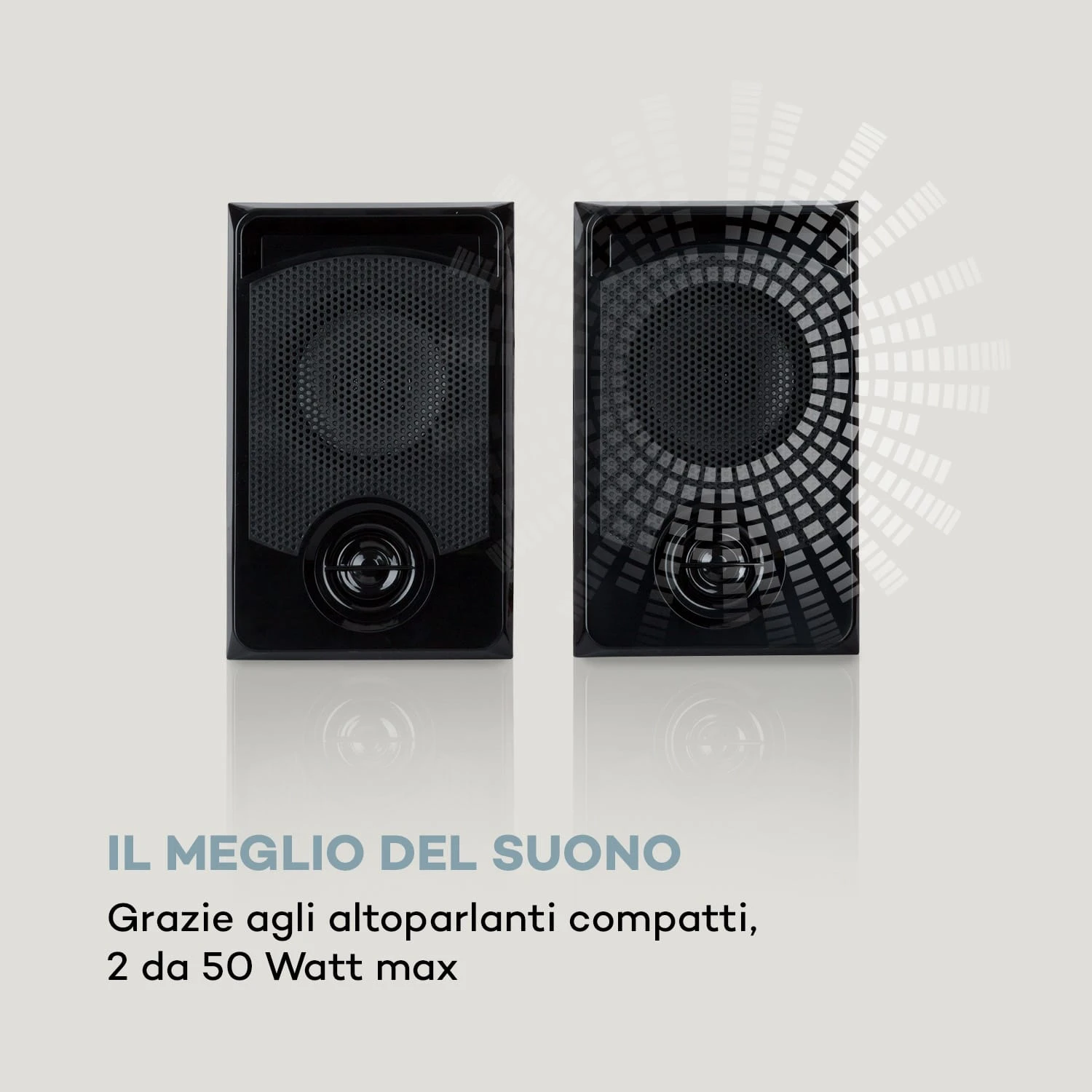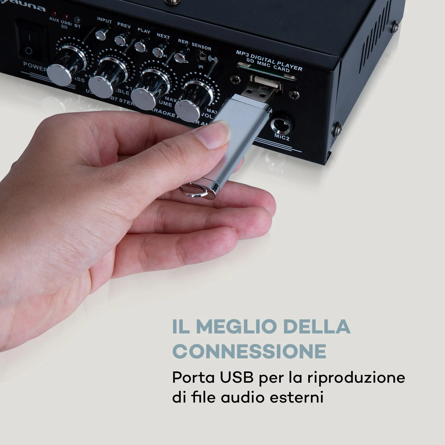 Un amplificatore e due altoparlanti con cabinet in legno e una potenza di 2 x 50 Watt max. forniscono una prestazione sonora forte con una qualità del suono stabile. La funzione Bluetooth consente uno streaming affidabile di innumerevoli file audio tramite smartphone, tablet o laptop. Collegamenti aggiuntivi consentono di ascoltare la musica in formati differenti: una porta USB/SD consente la riproduzione di musica in formato MP3, mentre un ingresso di linea assicura il collegamento a un lettore CD, un giradischi o una console di mixaggio. Oltre ad un pratico telecomando che ne facilita i comandi, la fornitura comprende anche due microfoni manuali a filo che possono essere comodamente collegati ai due ingressi per microfono. Le manopole, facili da usare, facilitano anche il controllo delle impostazioni dei bassi e degli alti.