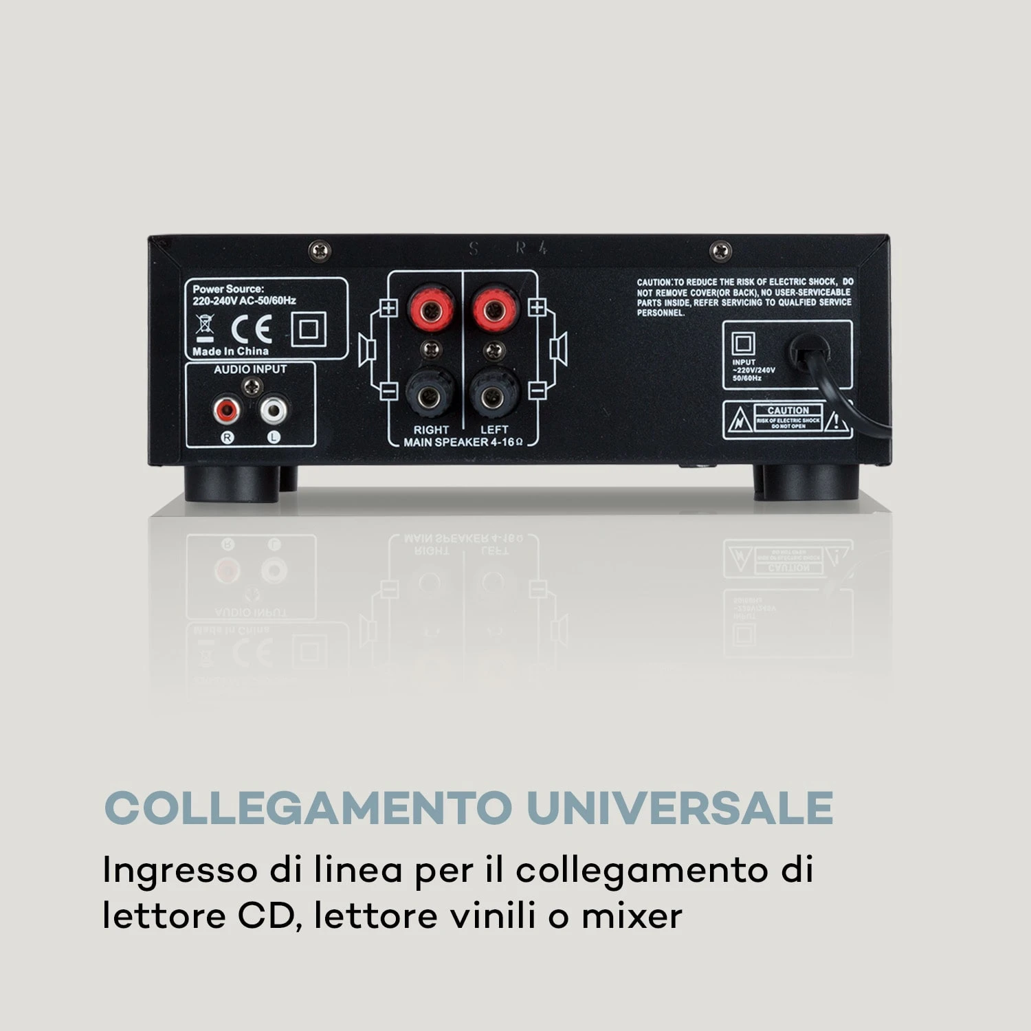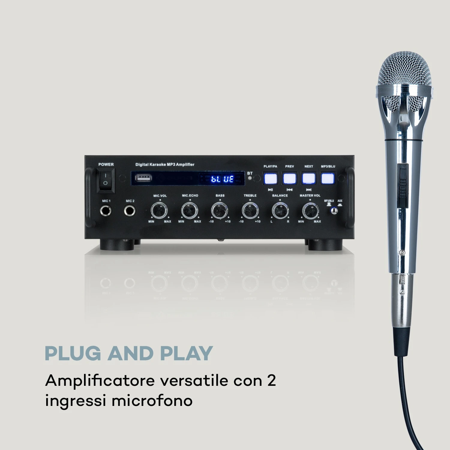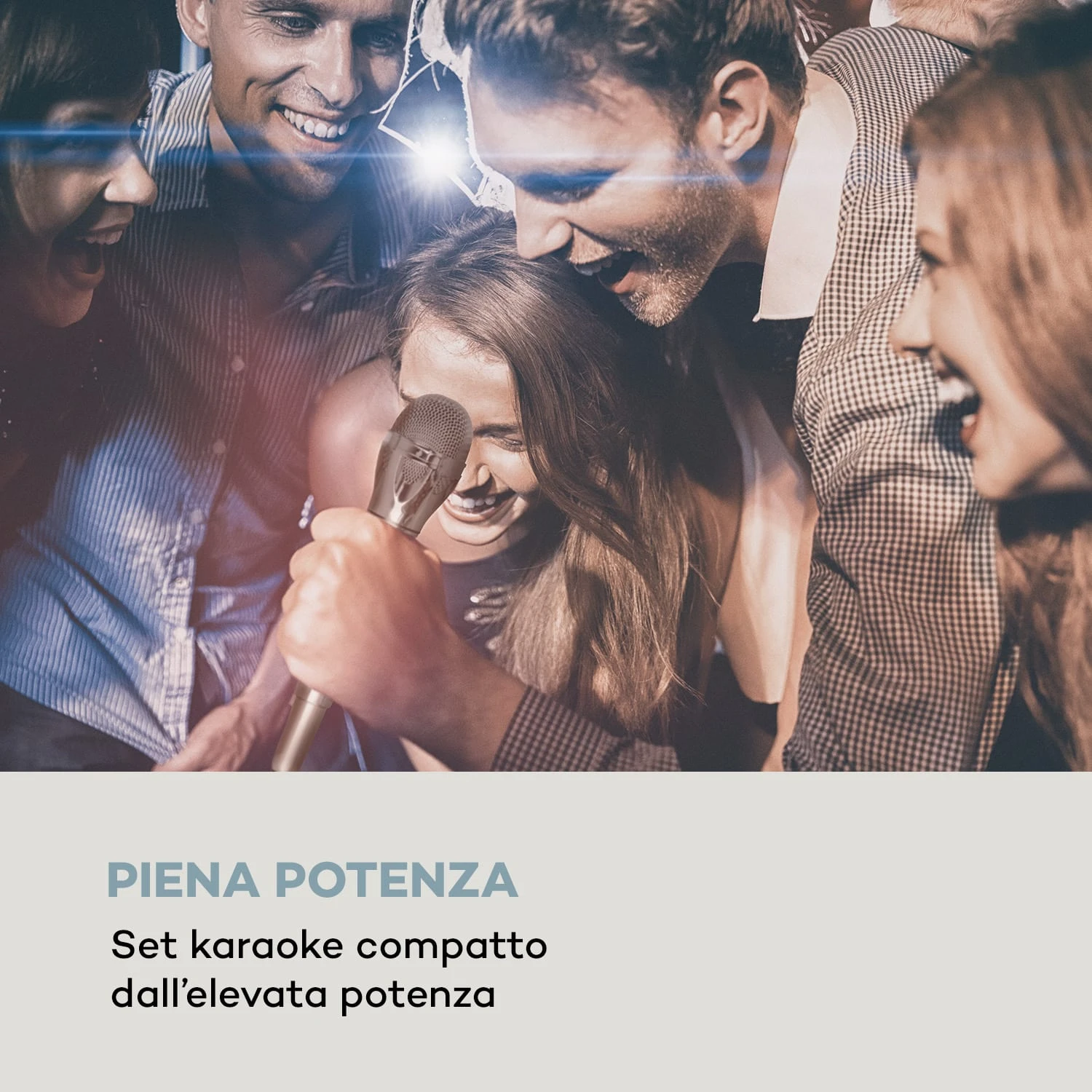 Un amplificatore e due altoparlanti con cabinet in legno e una potenza di 2 x 75 Watt max. forniscono una prestazione sonora forte con una qualità del suono stabile. La funzione Bluetooth consente uno streaming affidabile di innumerevoli file audio tramite smartphone, tablet o laptop. Collegamenti aggiuntivi consentono di ascoltare la musica in formati differenti: una porta USB consente la riproduzione di musica in formato MP3, mentre un ingresso di linea assicura il collegamento a un lettore CD, un giradischi o una console di mixaggio. La fornitura comprende anche due microfoni manuali a filo che possono essere comodamente collegati ai due ingressi per microfono. Le manopole, facili da usare, facilitano anche il controllo delle impostazioni dei bassi e degli alti. Con l’aiuto di un display a LED con retroilluminazione blu, tutti i processi possono essere visualizzati comodamente.