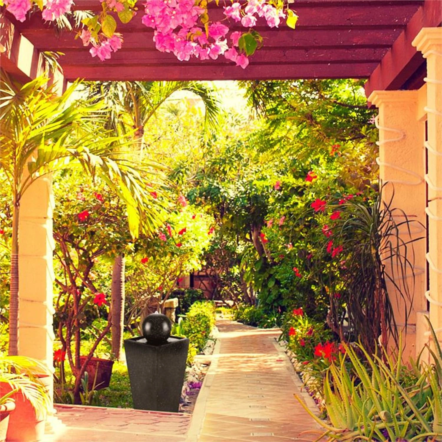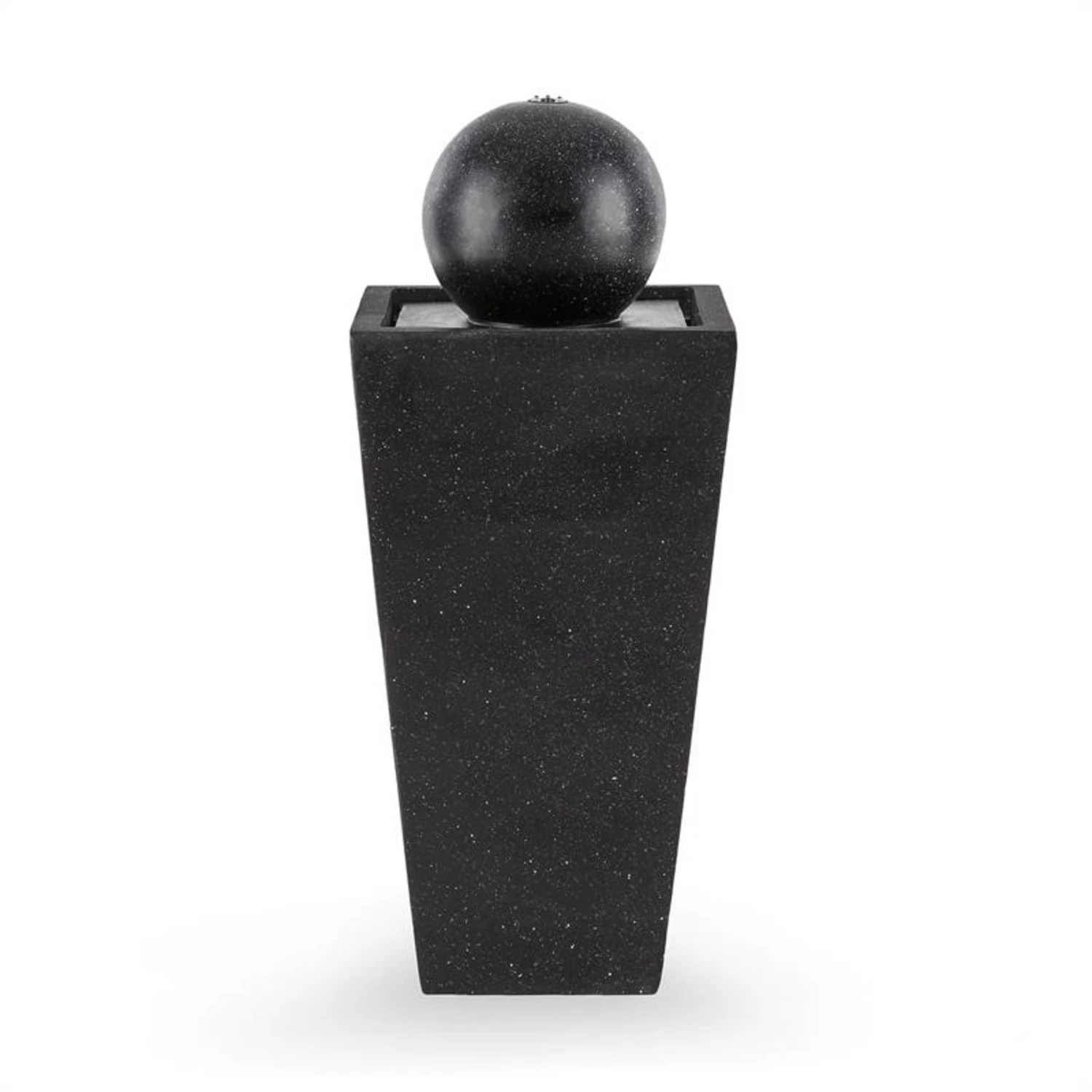 In corrente continua l’acqua fuoriesce dalla cima della fontana solare Königsbrunn di Blumfeldt e carezza la sfera discendendo fino al bacino da cui ricomincerà il suo viaggio. In questo modo si forma un affascinante gioco d’acqua, che invita alla meditazione, al relax e dona un accento di freschezza all’ambiente. Realizzata completamente in poliresina, la struttura si ispira a blocchi di basalto levigati, che donano charme ed eleganza alla fontana. Una corona LED illumina nelle ore notturne, immergendo lo spazio circostante in un’atmosfera da re.