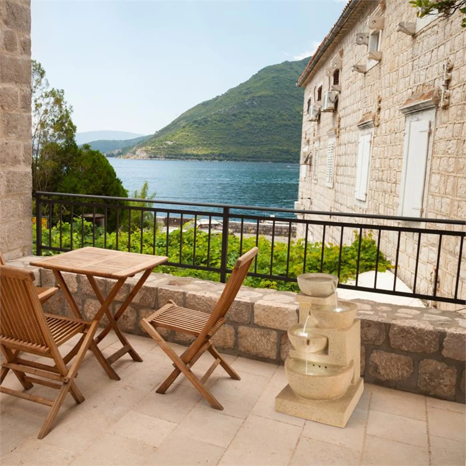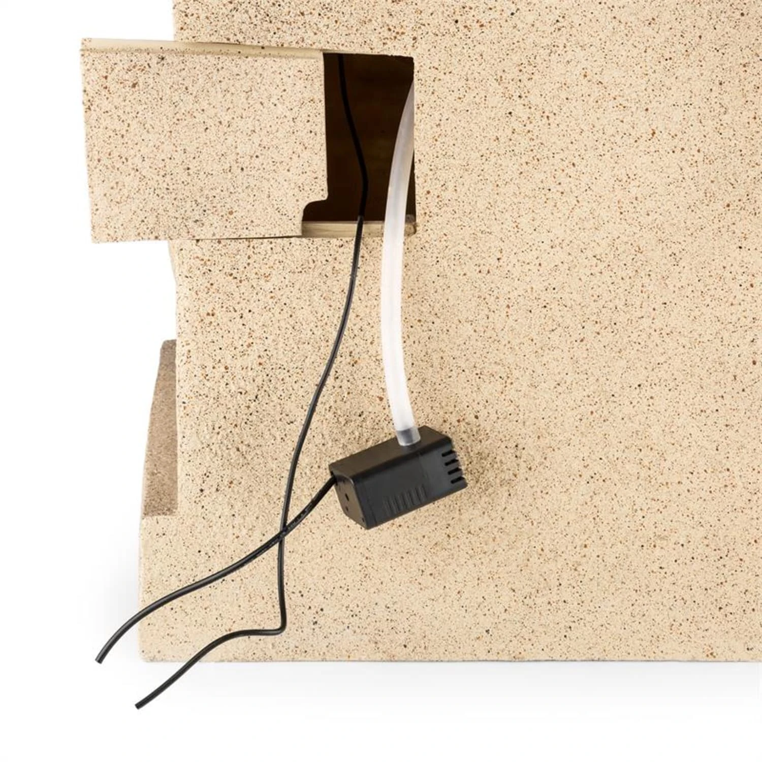 La Fontana da Giardino Korinth di Blumfeldt conferisce a giardini, terrazze o forni un flair antico. La Fontana Decorativa è realizzata in robusto poliestere con un’ottica in pietra arenaria e ricorda la famosa strettoia tra la penisola peloponnese e la grecia con le straordinarie pietre arenarie e il canale d’acqua blu. L’acqua sottoforma di fresca cascata fluisce sui quattro piani e incanta i sensi. Una pompa piccola ma potente garantisce una corrente continua con 250 litri di acqua in ricircolo all’ora e, inoltre, non c’è bisogno di riempirla di nuovo con altra acqua. Una piccola ghirlanda di luci a LED garantisce l’illuminazione notturna. La potenza della fontana, però, non si esaurisce: al posto della presa, la corrente proviene da un pannello solare con una potenza di 3 W, rispettoso sia dell’ambiente che del portafoglio. Il pannello solare, inoltre, grazie al lungo cavo conduttore e alla presa da terra di 30 cm può essere posizionato liberamente nel posto più soleggiato. Esso, oltre a dare energia alla pompa, carica anche la batteria a litio 7,4 V / 2000 mAh integrata, in modo da rendere la fontana funzionale anche di sera.