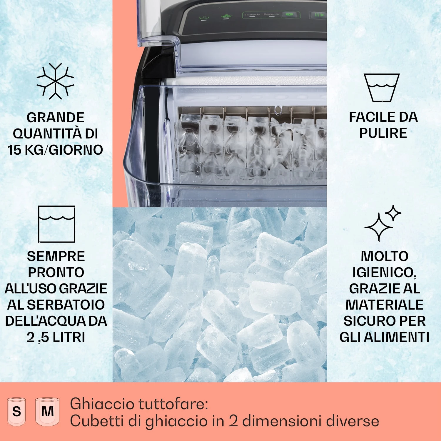 La macchina del ghiaccio è in grado di preparare fino a 15 kg di cubetti di ghiaccio in 24 ore. Basta riempire il serbatoio di 2,5 litri con l’acqua, scegliere la grandezza dei cubetti desiderata e si può iniziare: dopo 27 minuti i primi cubetti sono pronti, i più grandi hanno bisogno di 30 miinuti. Ogni 20-23 minuti il rifornimento di ghiaccio nel contenitore di 600 grammi non aspetta altro che essere utilizzato. Per una semplice distribuzione il contenitore del ghiaccio può essere rimosso.