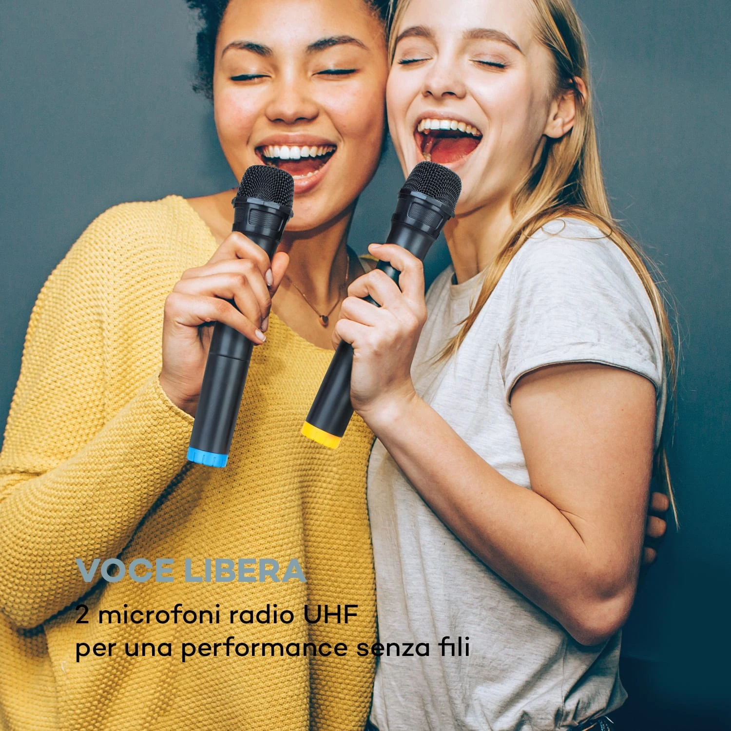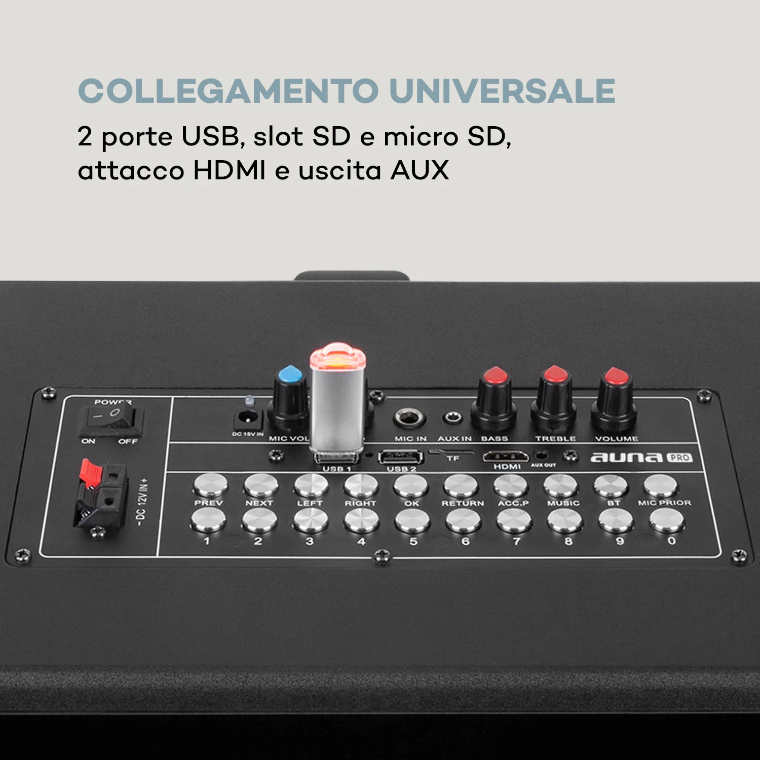 Grazie alla funzione trolley, all’ampio display touch, ai 2 radiomicrofoni UHF senza fili e alla batteria da 12V/12A a lunga durata, l’impianto karaoke KTV di auna Pro è il dispositivo ideale per tutti gli amanti del karaoke.