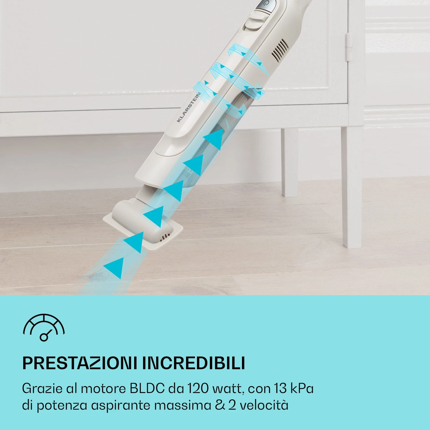 Compatto, potente e senza sacchetto: l’aspirapolvere portatile a batteria LARMA di Klarstein si occupa con slancio di polvere, peli e sporco. Le dimensioni compatte lo rendono perfetto per pulire divani, imbottiture e auto. Il potente motore dell’aspirapolvere LARMA, con un’autonomia massima di 32 minuti, aspira con facilità capelli, briciole e lanugine e li raccoglie nell’apposito contenitore dotato di filtro EPA E10. La funzione 2 in 1 con spazzola per mobili e attacco per imbottiture raggiunge anche i punti più difficili, mentre la stazione con cavo USB-C assicura una ricarica particolarmente comoda.
