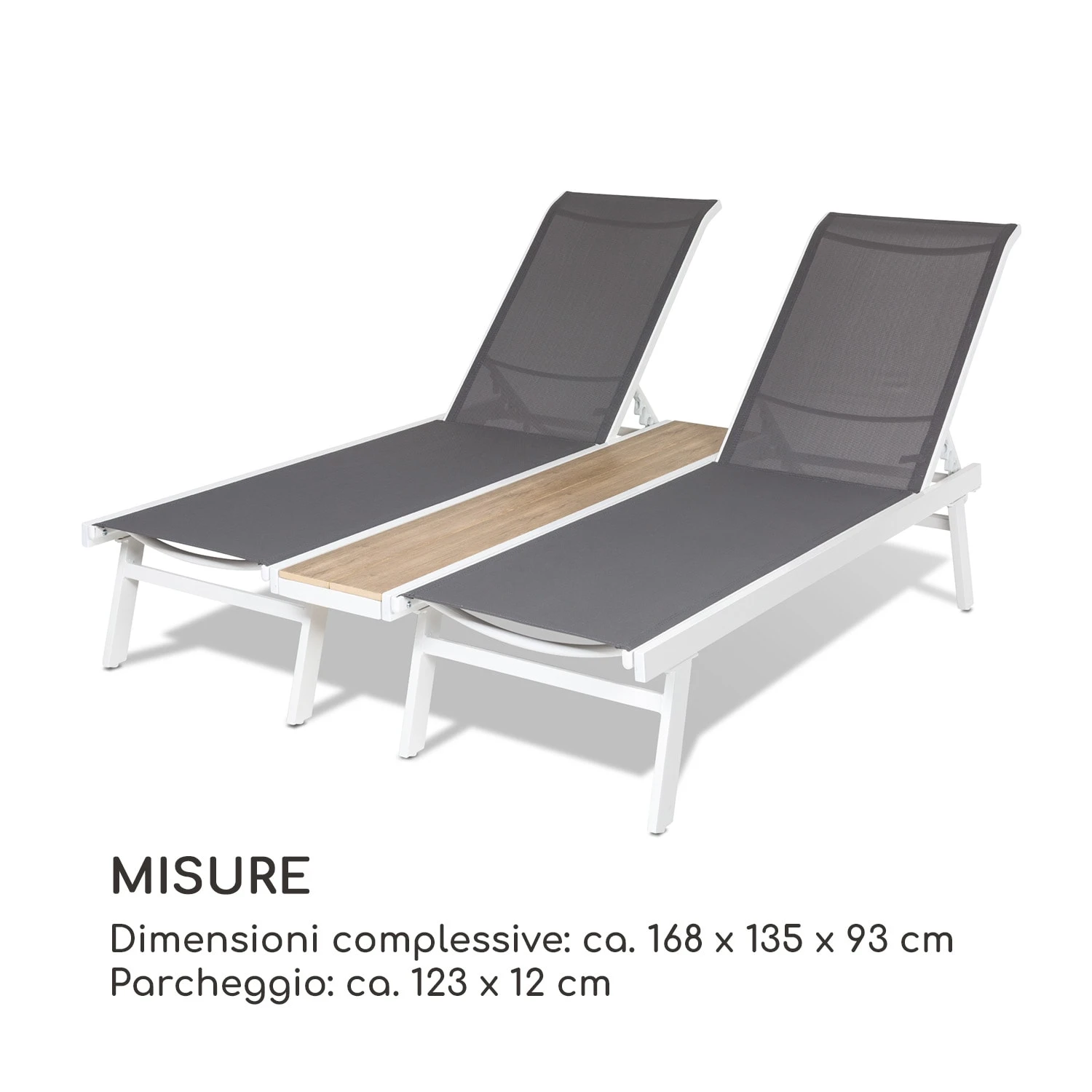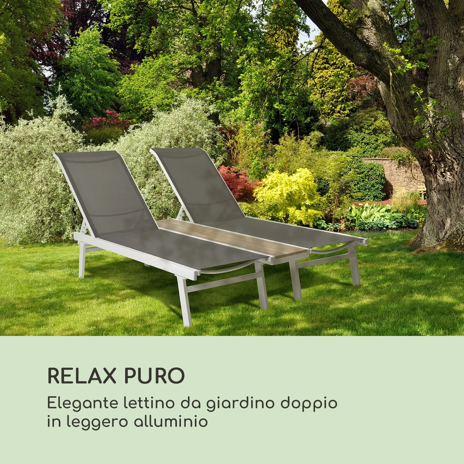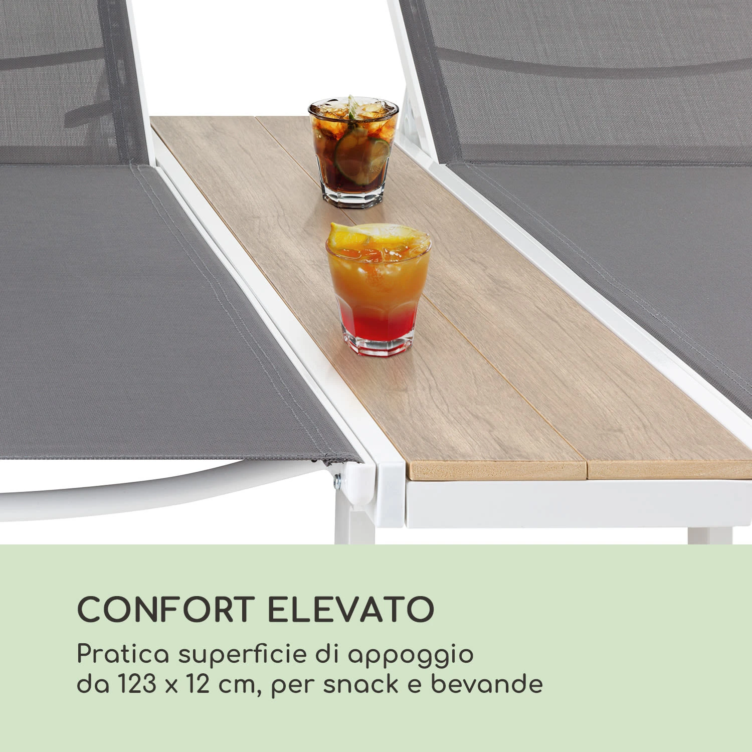 Il relax assume una nuova forma: il lettino Pompei di blumfeldt in alluminio leggero con verniciatura a polvere offre spazio per due persone, grazie alle sue due superfici di sdraio parallele. Il rivestimento idrorepellente in textilene resistente permette di sdraiarsi comodamente, mentre gli schienali regolabili in cinque posizioni permettono di trovare il cantuccio perfetto per leggere, lavorare o rilassarsi. Il lounger è migliorato grazie alla presenza tra le due sdraio di un’elegante area di stoccaggio per snack e bevande. Potrai utilizzare i lettini insieme alla zona di stoccaggio, ma anche separatamente senza questo accessorio. Nonostante il peso relativamente basso, il lettino Pompei di blumfeldt è estremamente stabile e può accogliere 120 kg per lettino.