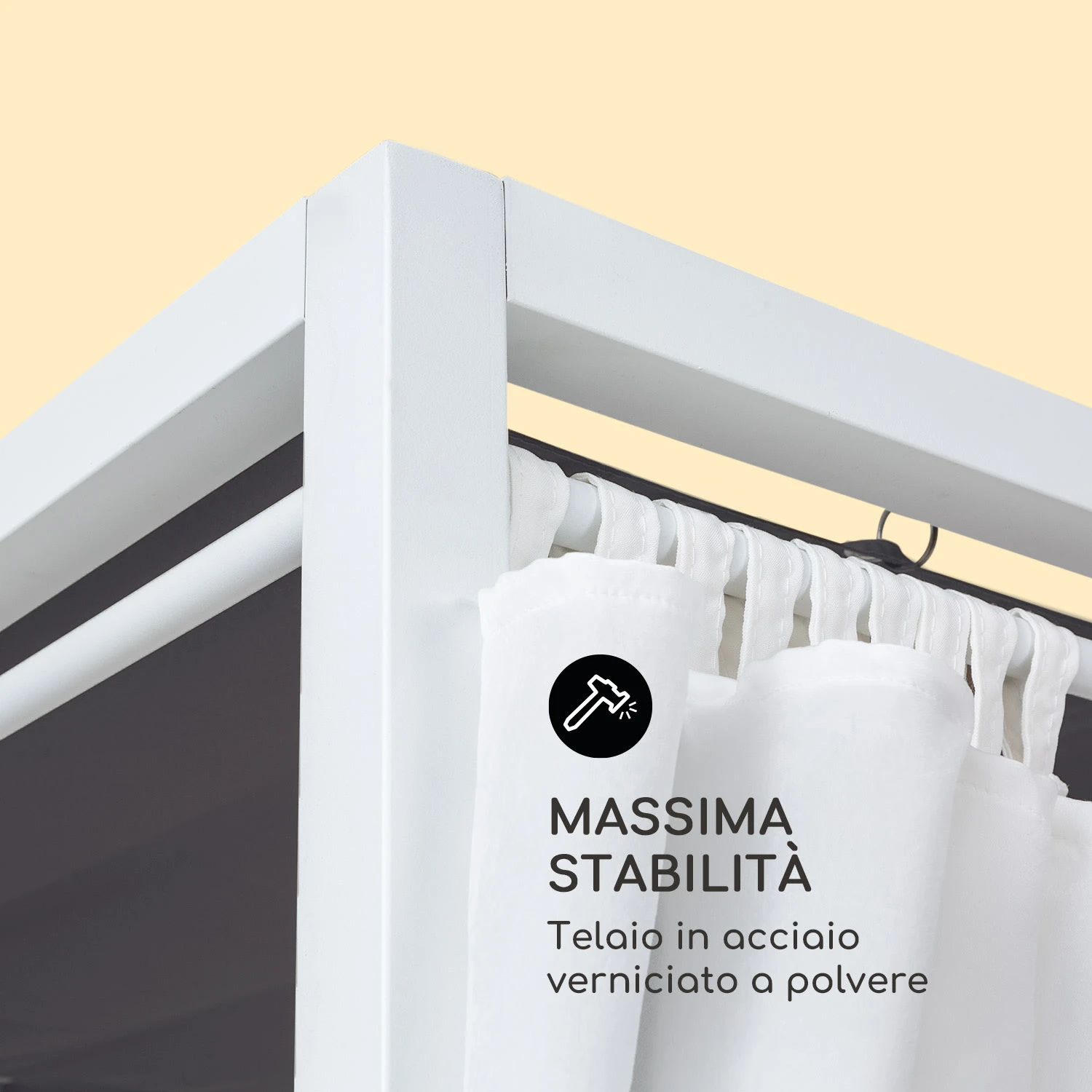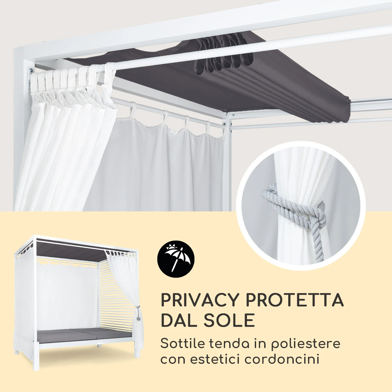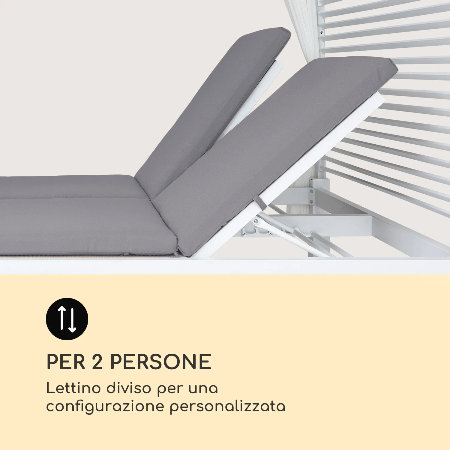 Un letto a baldacchino all’aperto: c’è qualcosa di più bello in estate? In giardino, in terrazza, per un rilassante riposino dopo pranzo o anche per una nottata sotto le stelle – l’esclusivo lettino Eremitage Double Lux di Blumfeldt sotto forma di un bellissimo letto a baldacchino ti invita a rilassarti. Ti incanterà solo a guardarlo e ti sorprenderà con il massimo comfort. A questo scopo, è dotato di imbottiture morbide che hanno uno spessore di 6 cm. È possibile regolare lo schienale in 4 diverse posizioni secondo il proprio livello di comfort – per leggere, dormire, sognare e altro ancora. La parete posteriore è costituita da singole lamelle in modo che ci sia una buona circolazione dell’aria anche quando si chiudono le tende. Per ore di sole e una vista sul cielo stellato puoi aprire il tetto e farlo scorrere come ti pare. Chiuso, ti protegge in modo ottimale dalla forte luce del sole.