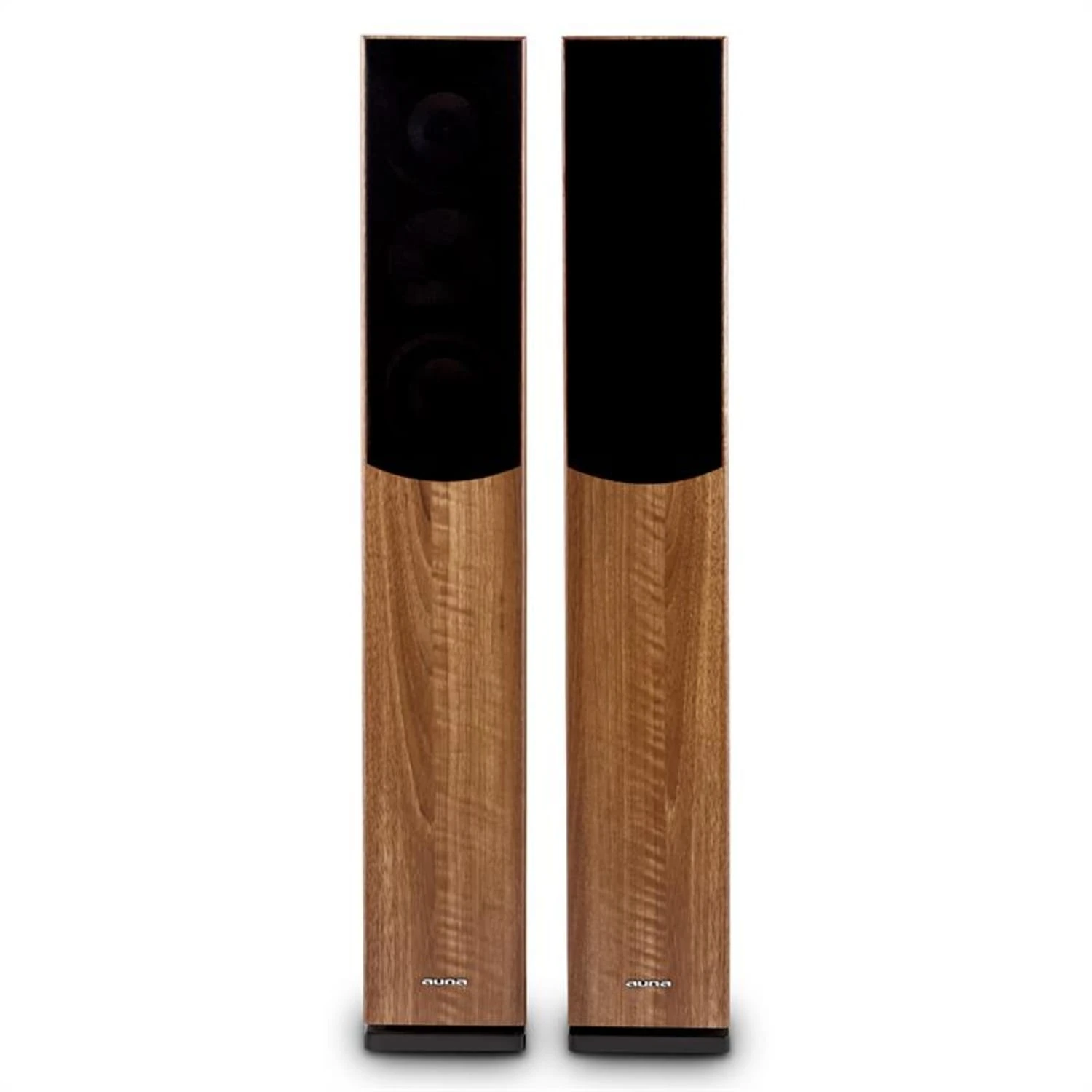 Visivamente, il dispositivo vanta la presenza di un tweeter con rivestimento in elegante alluminio e due midrange con membrana in oro. I terminali di alta qualità con contatti dorati garantiscono una perfetta trasmissione del segnale. La base in noce dei diffusori Auna assicura un’elevata stabilità durante la riproduzione.