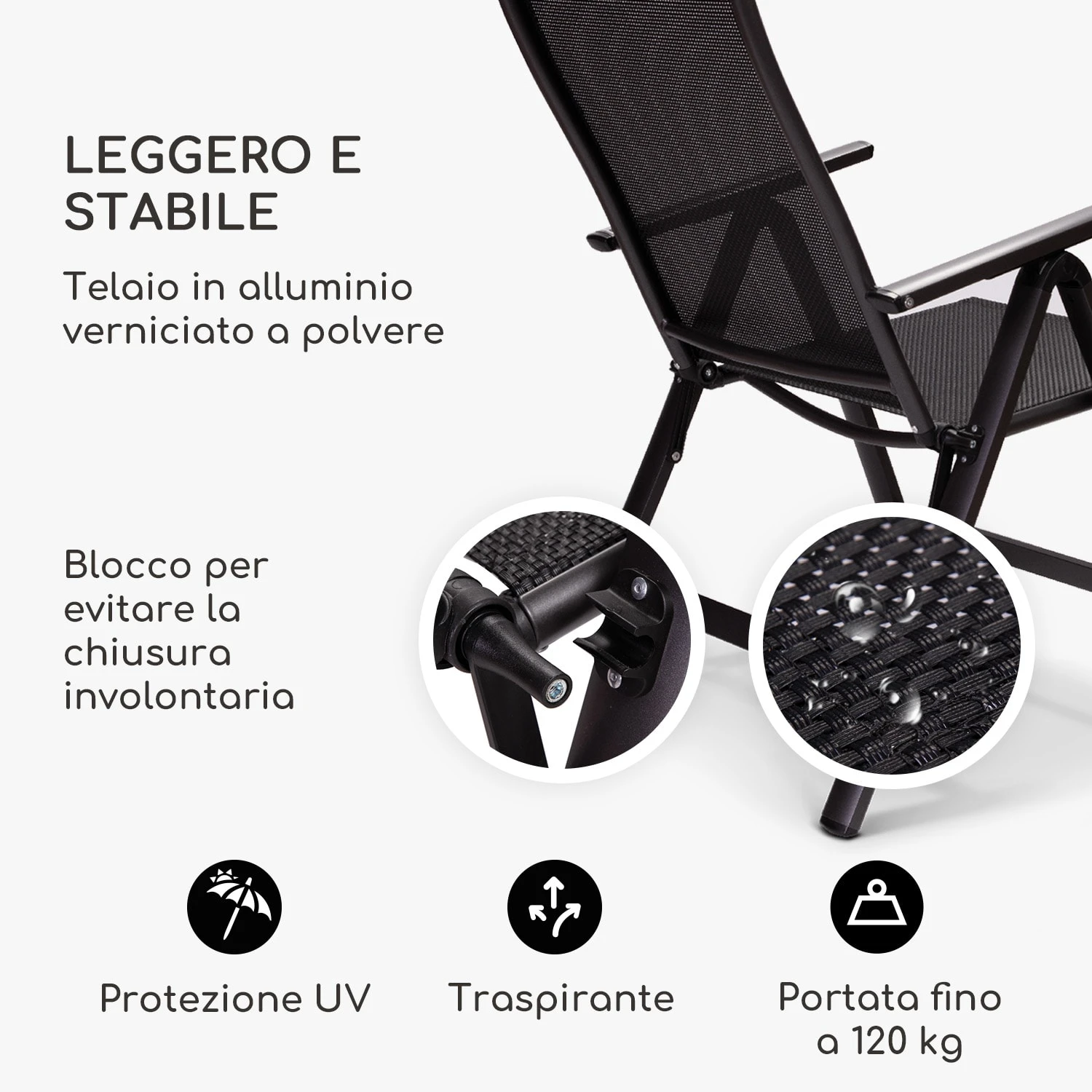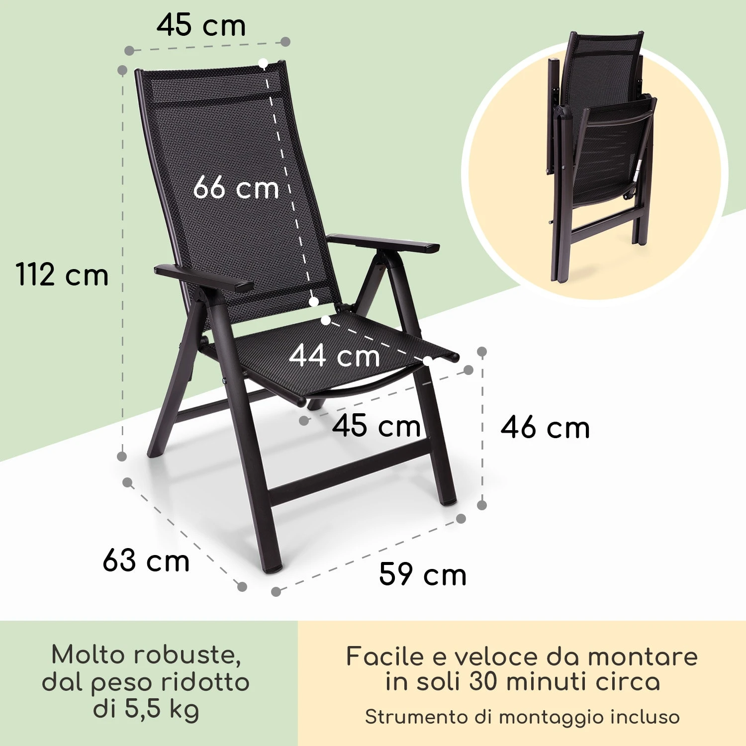Grazie alla sedia da giardino London di blumfeldt e alla sua superficie in textilene di alta qualità vi sembrerà di librarvi sulle nuvole. Per soddisfare tutte le necessità di relax, lo schienale mette a disposizione un totale di 6 posizioni di seduta. La superficie in textilene è resistente alle intemperie, asciuga rapidamente e può essere pulita senza alcun problema. In questo modo, la sedia è sempre pronta ad accogliervi per una pausa rilassante baciati dal sole. Anche la longevità della vostra sedia è assicurata dai materiali accuratamente selezionati: il telaio è realizzato in robusto alluminio per la massima resistenza e un peso contenutissimo di soli 5,5 kg. Un rivestimento a polveri del materiale garantisce ulteriore resistenza alle condizioni meteorologiche. Grazie al semplice meccanismo pieghevole, la sedia può essere richiusa per facilitare lo stoccaggio o il trasporto. Per la massima sicurezza, si trova una leva che impedisce la chiusura involontaria della sedia da giardino.