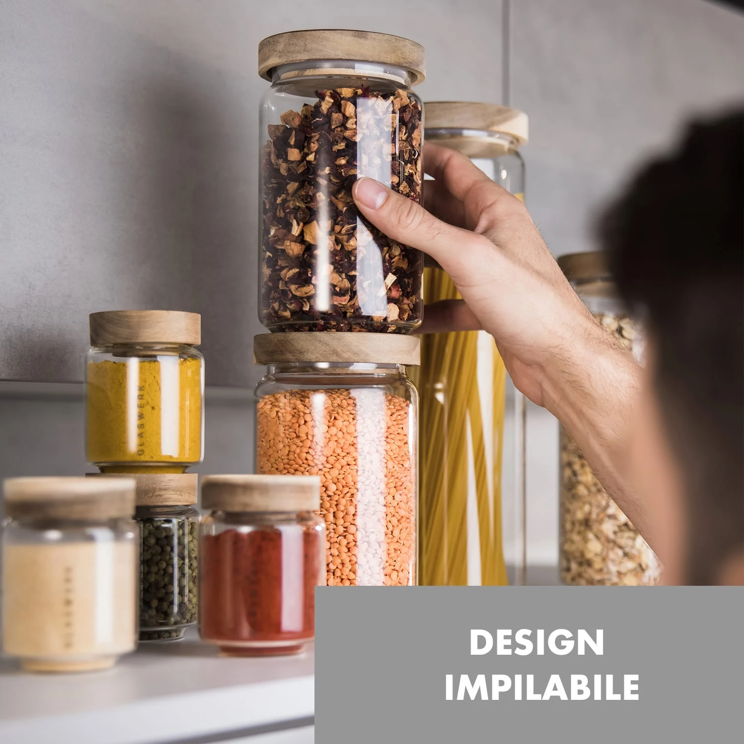 I barattoli per conserve sono di vetro borosilicato infrangibile, resistenti al calore e al freddo e leggerissimi. La guarnizione in silicone priva di BPA con il pratico coperchio in legno d’acacia assicura l’ermeticità al 100 %. I barattoli per conserve Lovage di Klarstein da 1,1 litri offrono spazio a tutte le conserve. I contenitori trasparenti sono perfetti per conservare spaghetti, chicchi di caffè, farina, zucchero oppure cereali. Catturano l’attenzione sul ripiano della cucina e sono impilabili grazie alla forma dei coperchi.