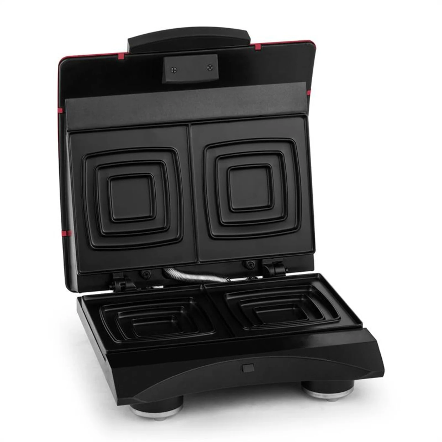 Grazie alle dimensioni compatte, l’alloggiamento in acciaio lucido e lo schermo anteriore semispecchiato occupano poco spazio in cucina. In tal modo, è possibile inserire sulla vostra credenza anche il Sandwichmaker di Klarstein. Con la potenza di 700 Watt è possibile preparare nell’arco di 2-3 minuti sandwiches dorati all’esterno e soffici all’interno. Il motivo a piani delle piastre riscaldanti che ricorda il tempio Maya rappresenta un altro motivo di attrazione. Per il controllo ottimale il Sandwich Buddy possiede due luci LED. Il rivestimento antiaderente evita che le fette di toast si attacchino alle piastre e di conseguenza la pulizia diventa molto più facile e volece.
