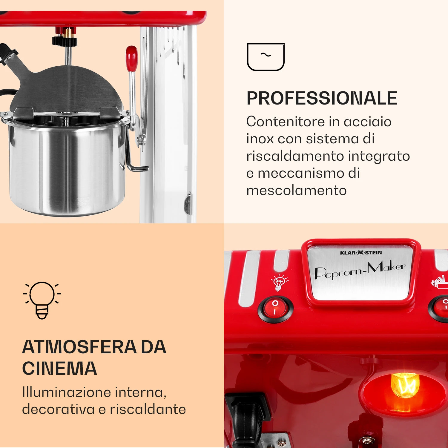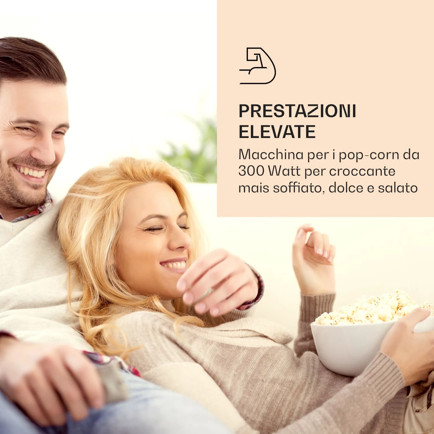 Una vera sensazione da cinema per la tua casa: la potente macchina per pop corn Volcane di Klarstein con il suo aspetto elegante Rock’n’Roll anni ’50 rende perfette le serate da film a casa tua! Con l’alta potenza, puoi fare pop corn freschi in poco tempo e la produzione stessa è un piccolo spettacolo: guarda i chicchi di mais soffiato che saltano dal bollitore. Grazie alla distribuzione uniforme del calore, nessun chicco si attacca sul fondo. L’illuminazione interna non serve solo a mantenere il pop corn caldo, ma mette abilmente in scena l’intero processo e l’elegante macchina per pop corn .