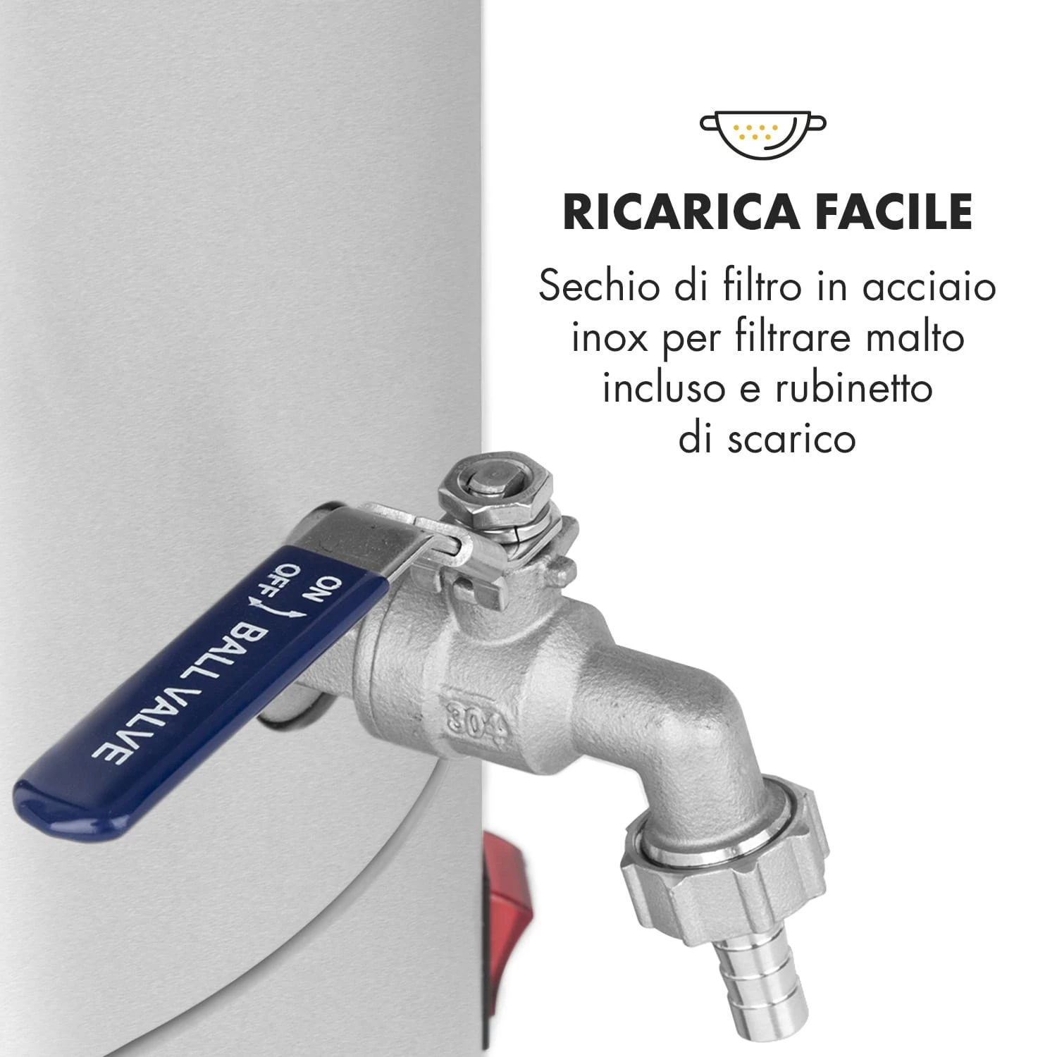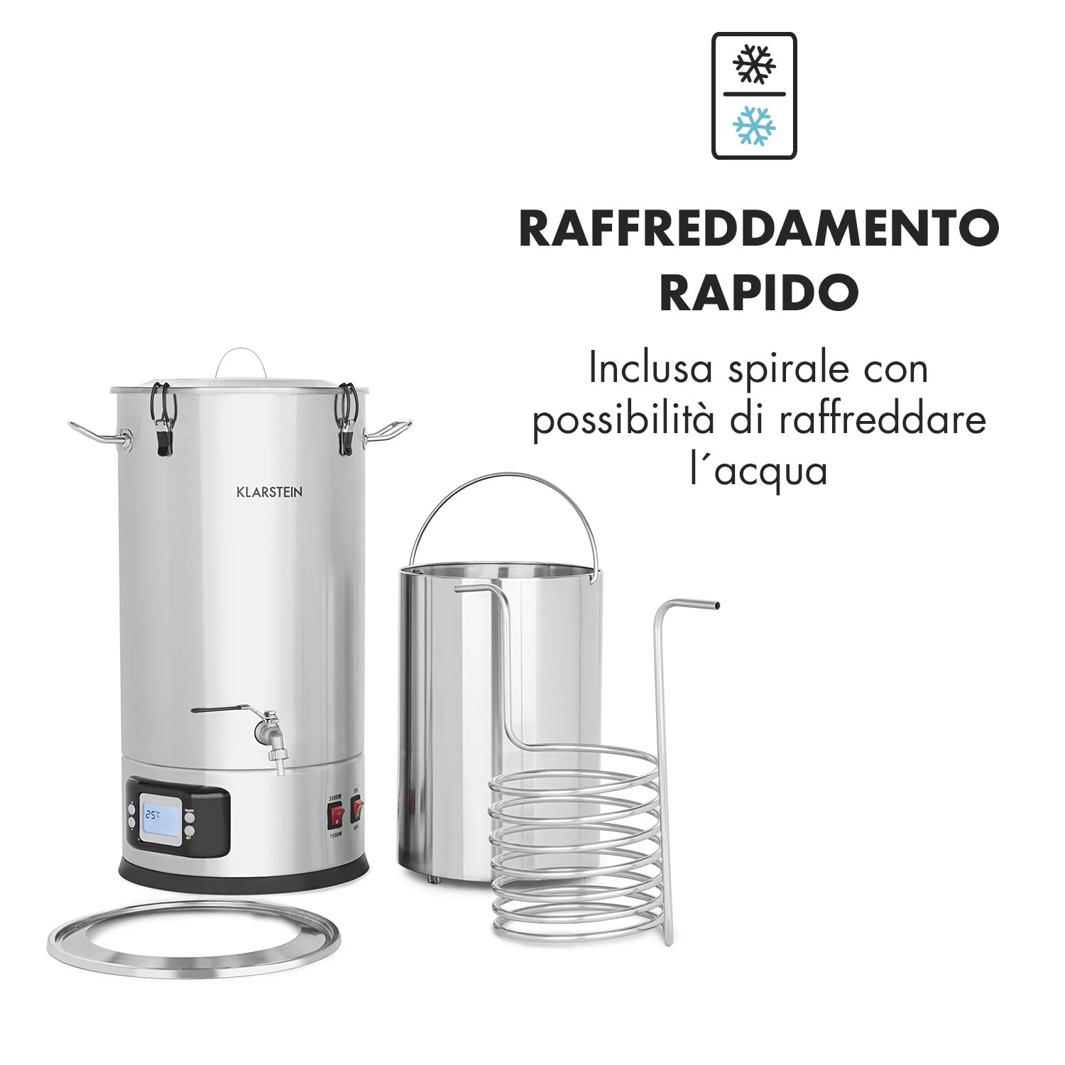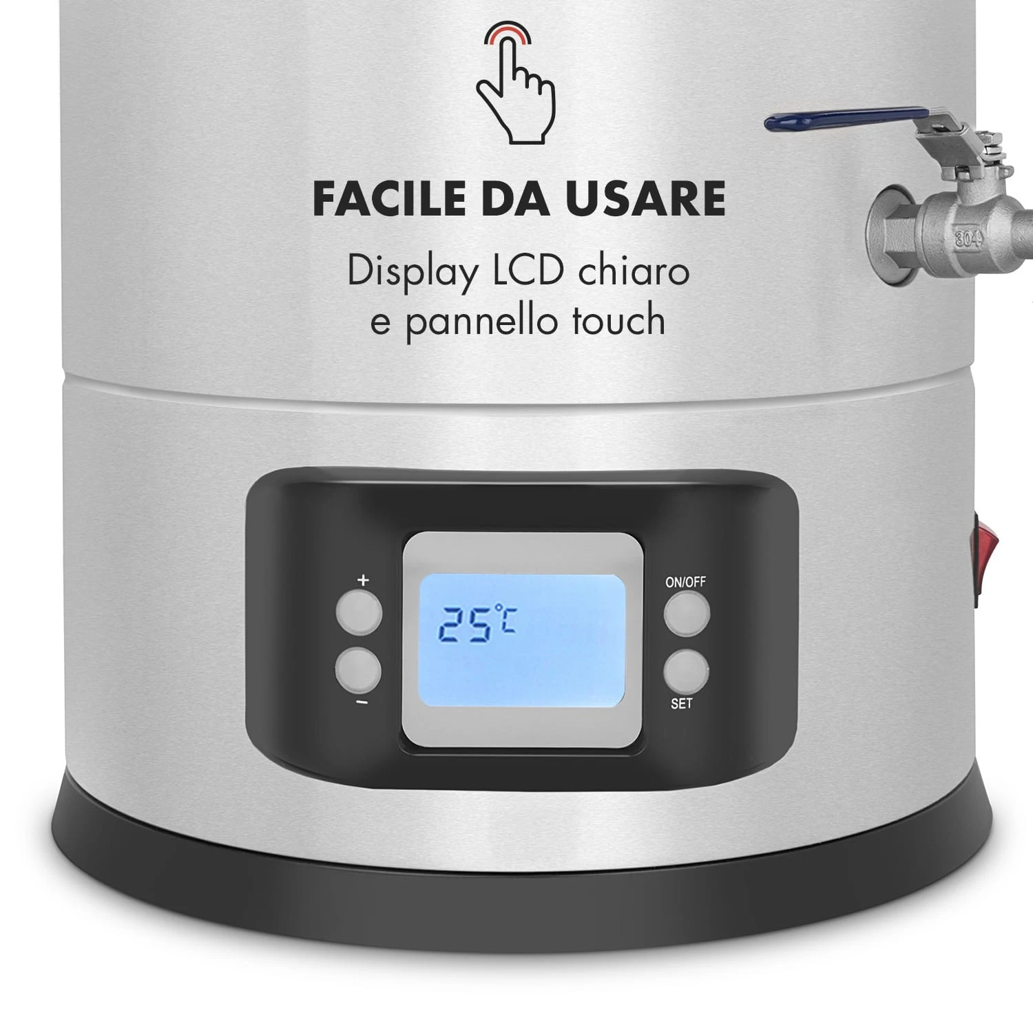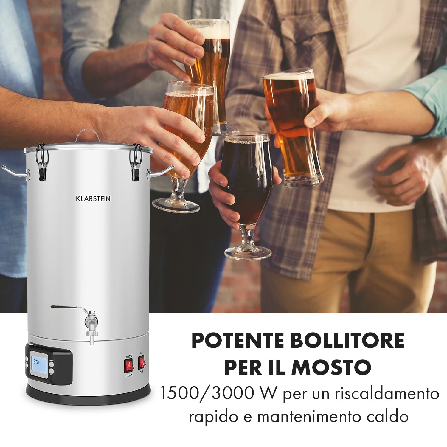 Che siate alle prime armi o esperti, il paiolo di ammostamento Maischfest di Klarstein è un set competo in 5 pz. per iniziare la produzione della birra in casa. Fino a 25 litri di preparato possono essere portati a ebollizione nel grande paiolo in acciaio inox a doppia parete. Un chiaro pannello di controllo touch con display LCD permette di impostare manualmente e con precisione temperatura, tempo di cottura e potenza. Sono disponibili due livelli di potenza da 1500 W per mantenimento temperatura e 3000 W per portare a ebollizione.