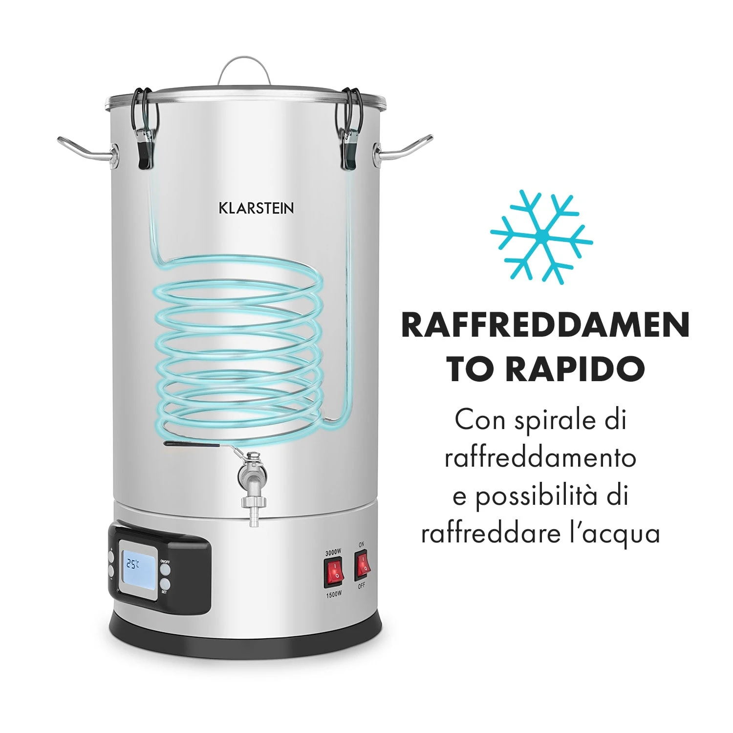 Che si tratti di un principiante o di un esperto birraio per hobby, il paiolo di ammostamento Maischfest di Klarstein fornisce praticamente un pacchetto completo composto da 5 pezzi per preparare il mosto di birra. Il grande paiolo in acciaio inox a doppia parete contiene fino a 28 litri di prodotto da bollire. Grazie a un chiarissimo pannello di controllo con display LCD, temperatura, tempo di cottura e prestazione possono essere impostati manualmente con precisione. Sono disponibili due livelli di potenza: uno da 1500 Watt per il mantenimento della temperatura e uno da 3000 Watt per portare a ebollizione il mosto. Il display LCD indica sempre con esattezza il grado di temperatura che c’è nel paiolo.
