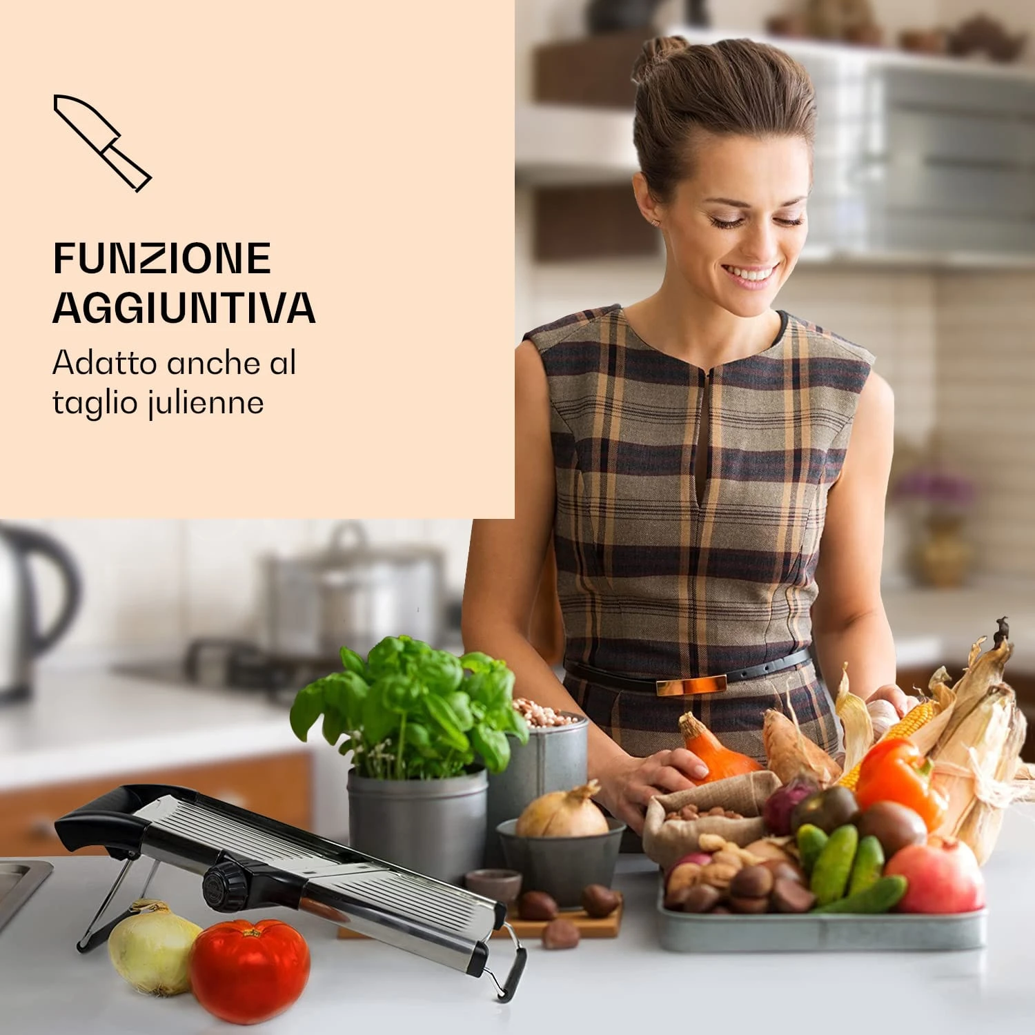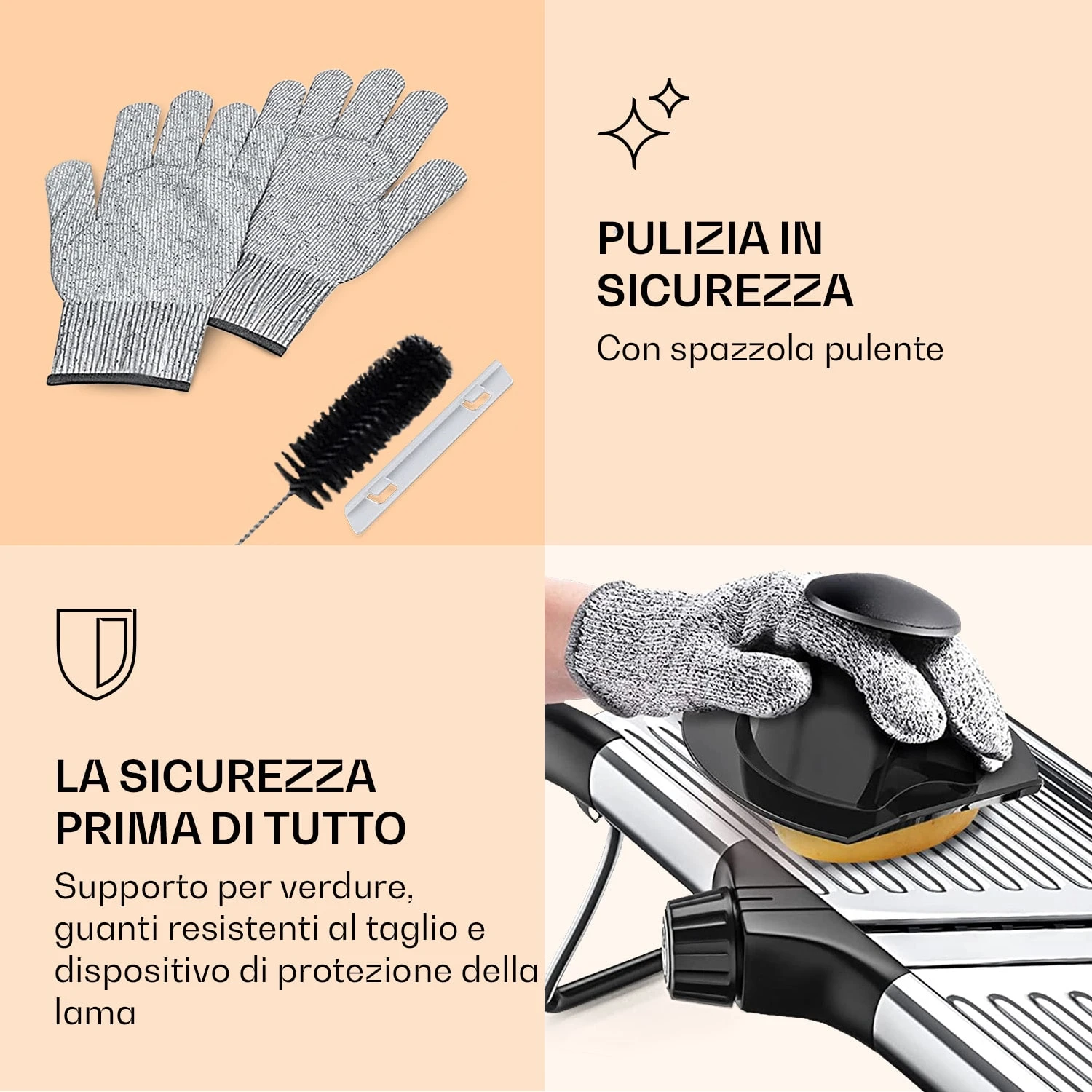 Vuoi risparmiare tempo in cucina e tagliare le tue verdure in modo rapido, facile e sicuro? Allora l’affettaverdure Mandoline di Gramercy by Klarstein diventerà senz’altro il tuo nuovo aiutante preferito in cucina. Con la sua lama ultra affilata, scorre con facilità e precisione anche attraverso verdure dure come patate o zucche. Non devi preoccuparti delle tue dita, dato che l’affettaverdure Mandoline è dotato di un pratico supporto per le verdure e di guanti di sicurezza antitaglio. Usa la manopola sul lato per impostare comodamente lo spessore desiderato, da sottilissimo fino a 9 mm. Mandoline è perfetta anche per tagliare le tue verdure preferite in bellissime strisce alla julienne. Inclusa in consegna troverai anche un’apposita spazzola per una pulizia pratica e sicura. Al termine della preparazione, basta piegare l’affettaverdure Mandoline e riporlo in un cassetto o in un armadio per risparmiare spazio.