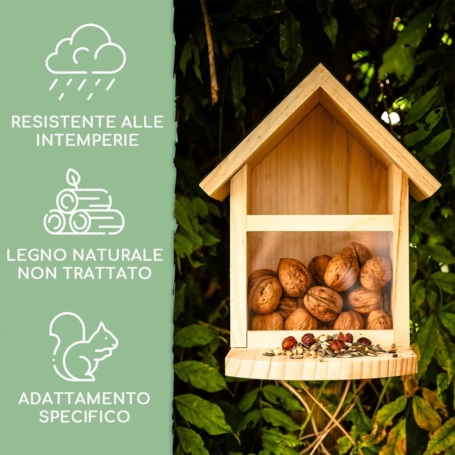 Noci, semi o frutti: nella mangiatoia di blumfeldt, gli scoiattoli trovano cibo con facilità soprattutto in inverno e presto li vedrai fare la fila per accaparrarsi qualche delizia. La mangiatoia in legno non trattato viene riempita con noci, nocciole, semi di girasole o pezzetti di carote, in modo che gli animaletti abbiano cibo a disposizione e facilmente raggiungibile anche quando gela o dopo estati di siccità. Il tetto a due falde assicura un facile accesso per gli scoiattoli tramite il pannello di plexiglas, in modo che possano raggiungere comodamente le prelibatezze all’interno. La copertura in cartone catramato repelle la pioggia e protegge la mangiatoia dal bagnato. Blocco dell’acqua e fessure di ventilazione assicurano che il cibo rimanga invitante e a lungo e che non si formi muffa. Il pannello in plexiglas rimovibile permette di avere sotto controllo il livello di riempimento e di pulire la mangiatoia con facilità se necessario. La grande piattaforma invita a banchettare e offre una stupenda possibilità di osservare gli animaletti da vicino nella loro quotidianità.