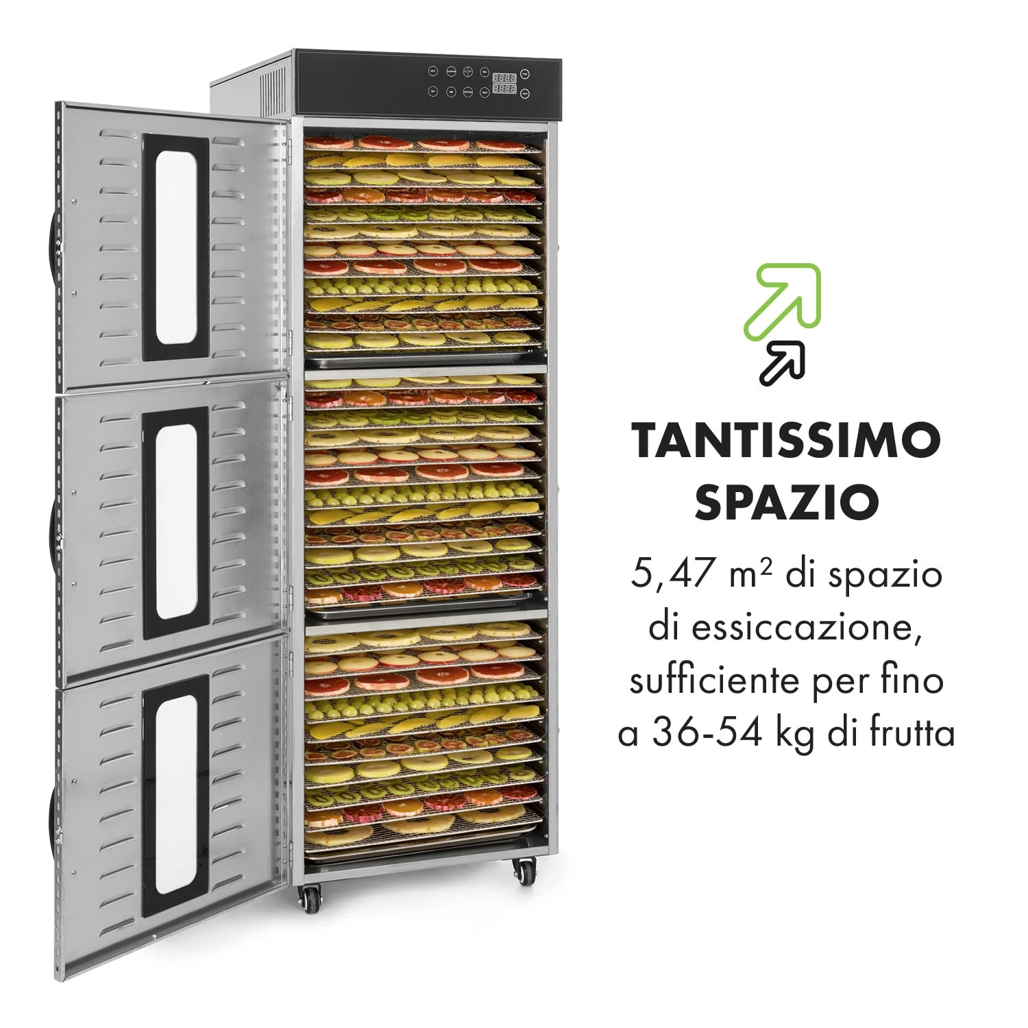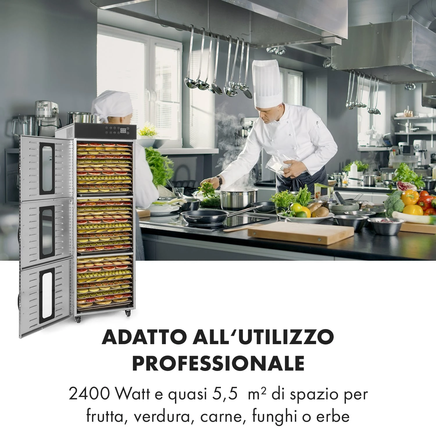 Con un’enorme potenza riscaldante di 2400 Watt e la distribuzione omogenea del calore, l’essiccatore Master Jerky 550 assicura la totale rimozione di acqua dagli alimenti in tempi brevi. 36 ripiani estraibili in acciaio inox offrono uno spazio di 40 x 38 cm per una superficie totale di 5,47 m²: le condizioni perfette per l’essiccazione professionale p. es. in negozi specializzati in beef jerky, tè o frutta secca. Per la preparazione flessibile di diversi alimenti, la temperatura è regolabile tra 40 e 90 °C sul pannello di controllo touch. Inoltre un timer fino a 24 ore garantisce la sintonia ottimale degli alimenti da essiccare. Grazie al processo di disidratazione completamente automatico con il mantenimento della temperatura esatta, tutto funziona alla perfezione. Così si mantengono minerali e vitamine fondamentali e il gusto si intensifica. Gli alimenti essiccati contengono fino a 4 volte più sostanze nutritive rispetto alla stessa quantità di alimenti freschi. Il Master Jerky 550 è adatto anche per la preparazione di fiori secchi per composizioni floreali o per l’estrazione delicata di erbe essiccate e tè.