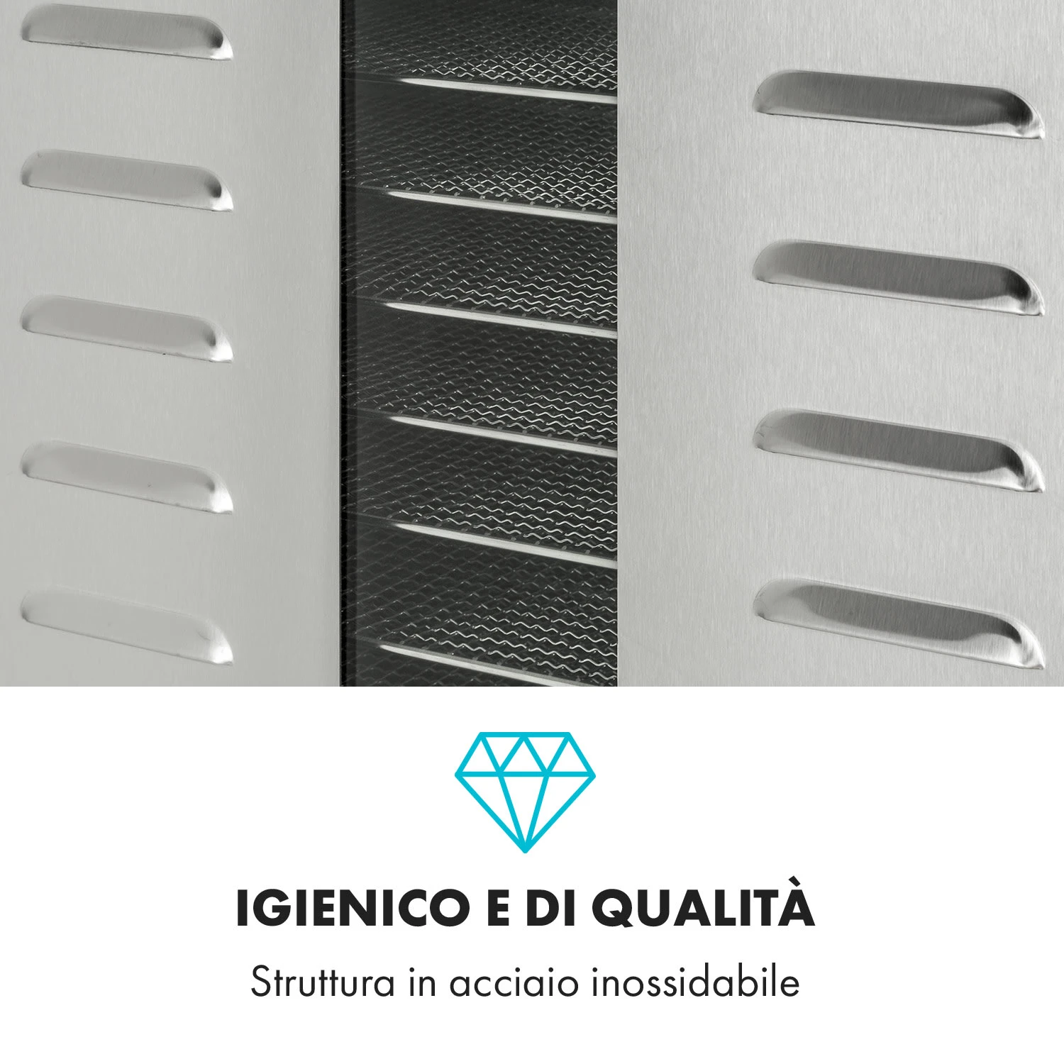 La pulizia dell’essiccatore dopo il processo di disidratazione èfacilissima: i ripiani in acciaio inox si lavano senza problemi a mano o in lavastoviglie. L’alloggiamento in acciaio inox si asciuga con semplicità e si sposta facilmente grazie alle ruote.