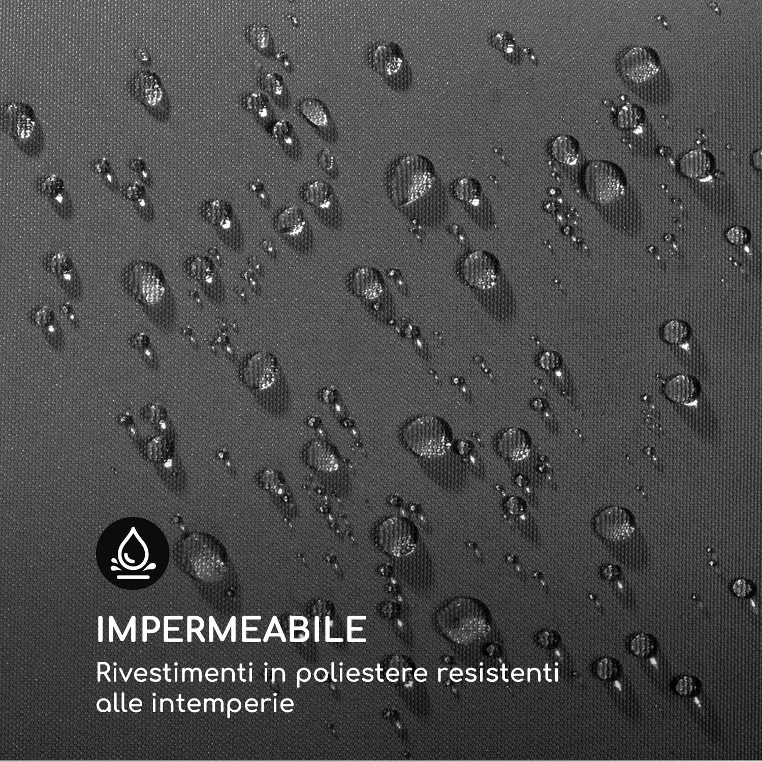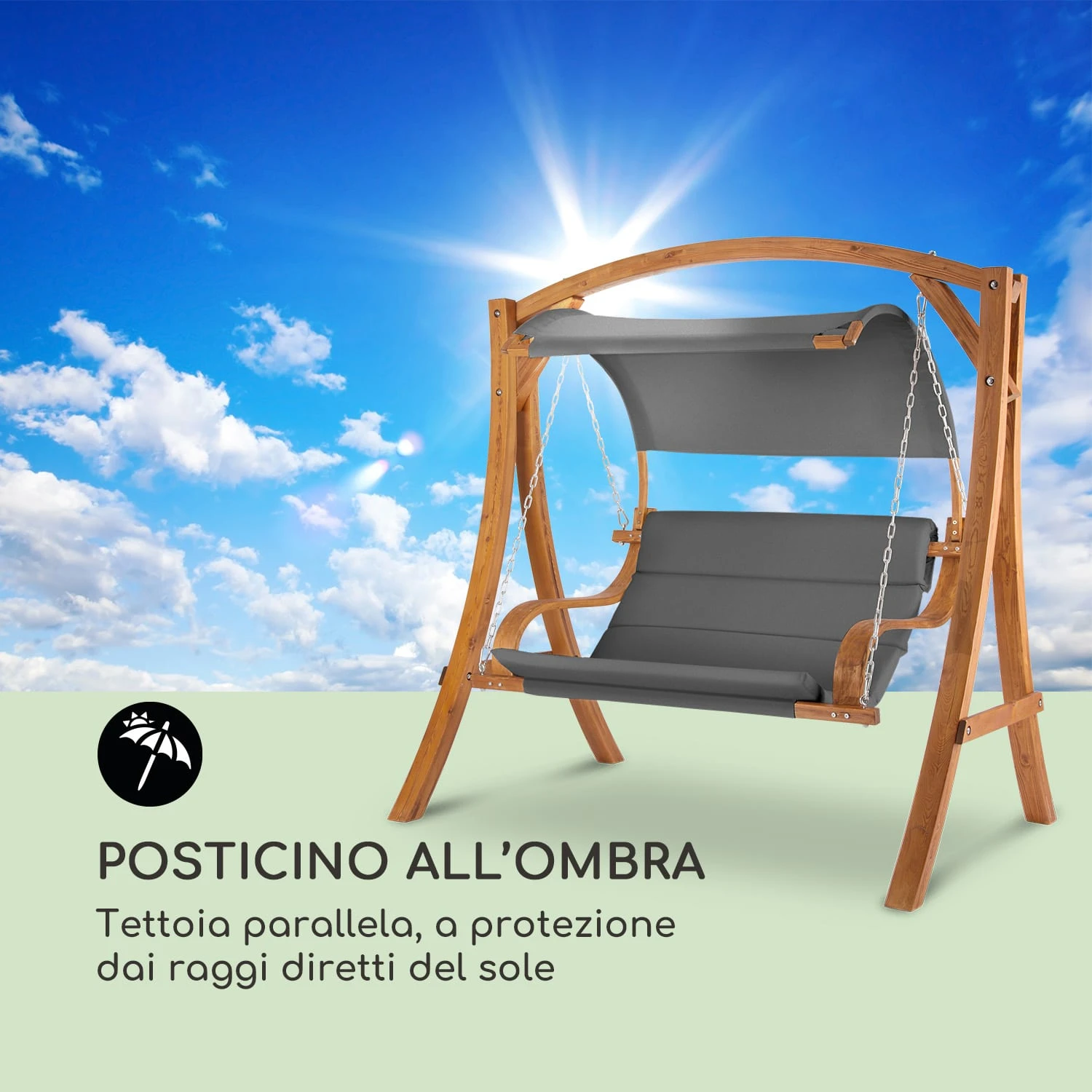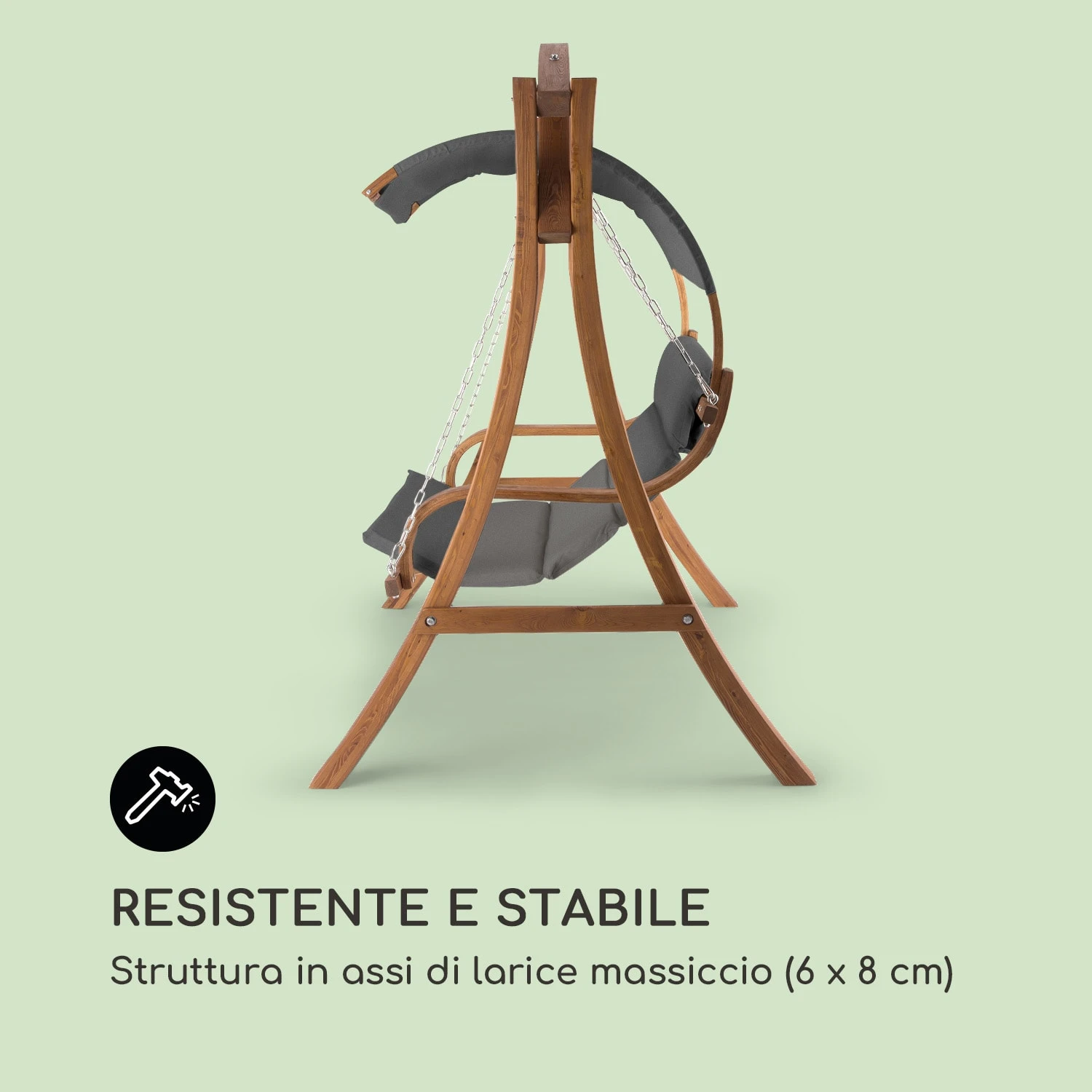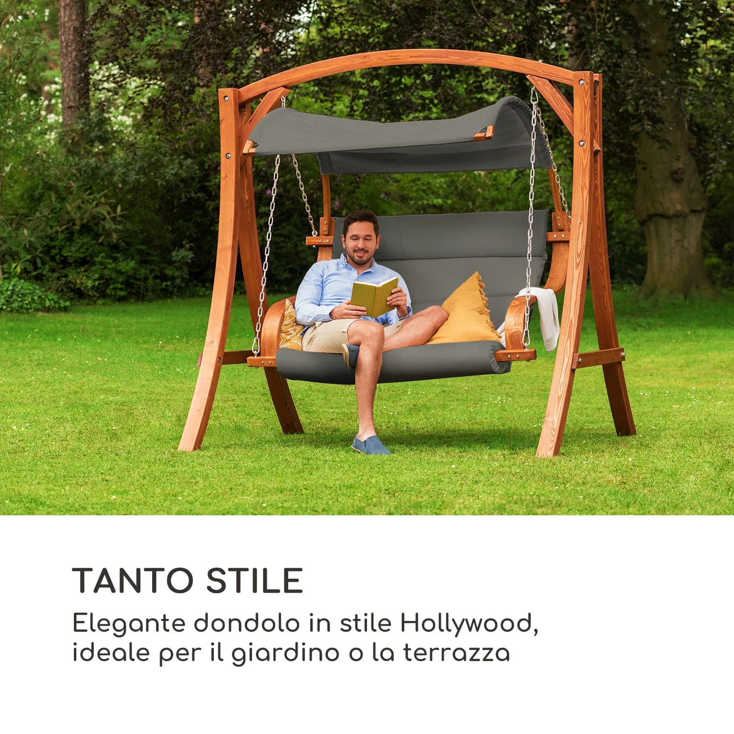 Con il dondolo Hollywood Maui di Blumfeldt è facilissimo dimenticare la vita quotidiana. Sulla sua superficie ergonomica di seduta e sdraio da 110 cm con un’imbottitura da 4 cm ci si dondola comodamente da soli o in due come su una sedia a dondolo. Il baldacchino inarcato fornisce sicurezza e protegge inoltre dai raggi solari, ovunque venga posizionato il dondolo. Soddisfa tutti i tuoi desideri anche per quanto riguarda la stabilità: travi in legno massiccio, catene in acciaio inox e viti zincate rendono la struttura estremamente stabile con una capacità di carico fino a 250 kg. Il baldacchino grigio scuro e il legno di larice verniciato e resistente alle intemperie risvegliano l’atmosfera estiva in ogni angolo.