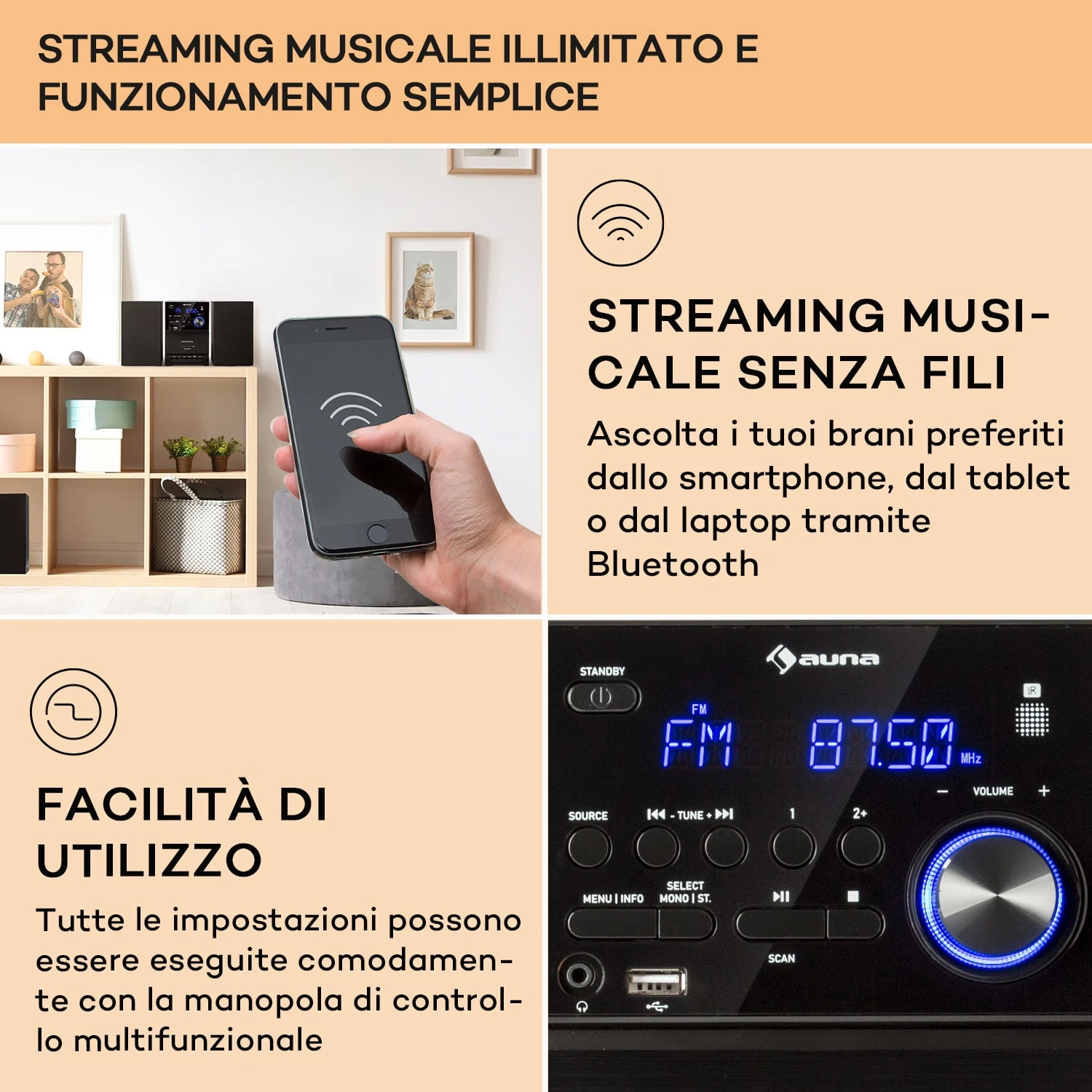 L’impianto stereo MC-40 DAB di auna è un dispositivo potente, multifunzionale, elegante e a tutto tondo, che, nonostante le sue dimensioni compatte, è in grado di arricchire ogni appartamento con la miglior qualità del suono.